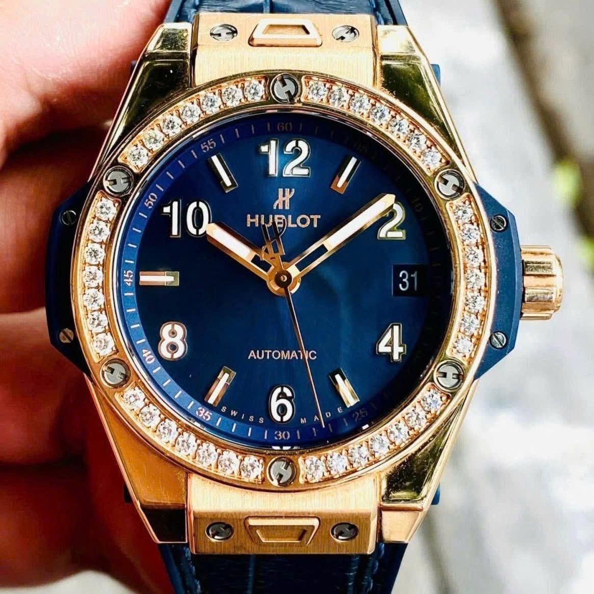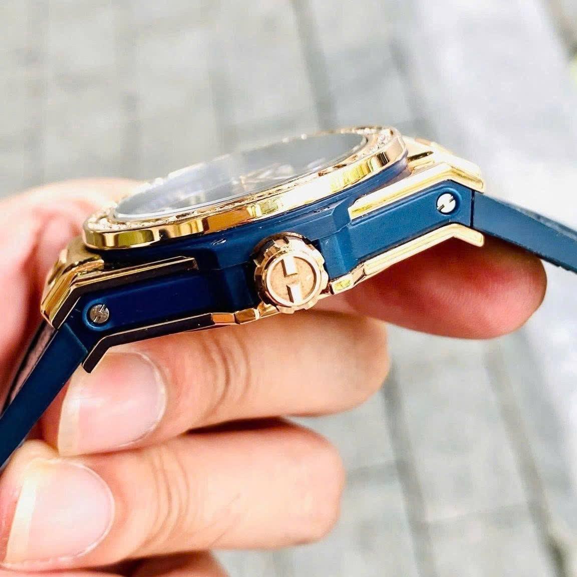 - Vành bezel chế tác từ vàng hồng 18k và nạm 42 viên kim zin hãng hạt to cực kỳ nổi bật và thu hút mọi ánh nhìn.