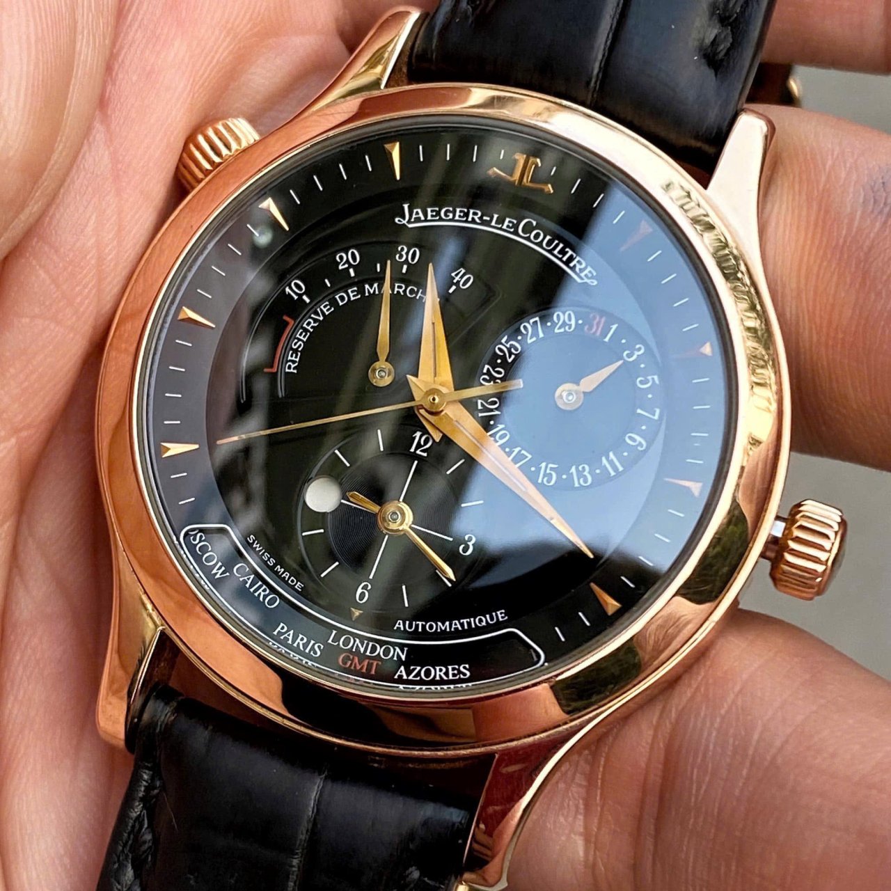 ** Mẫu đồng hồ Jaeger LeCoultre Master Geographic 38mm sở hữu lớp vỏ vàng hồng 18k được đánh bóng mượt mà, đi kèm với đó là mặt số màu đen được hoàn thiện chải xước sắc nét và thẳng tắp.
