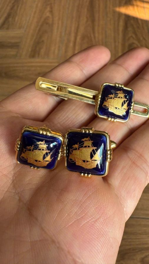 ⛵ Kẹp Caravat & khuy măng sét Limoges Gold France new 100% màu xanh coban thuận Buồm xuôi gió siêu đẹp