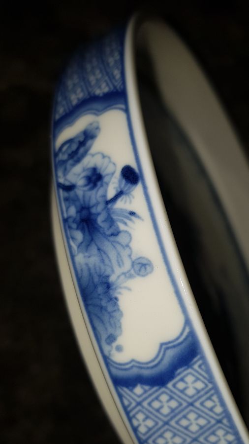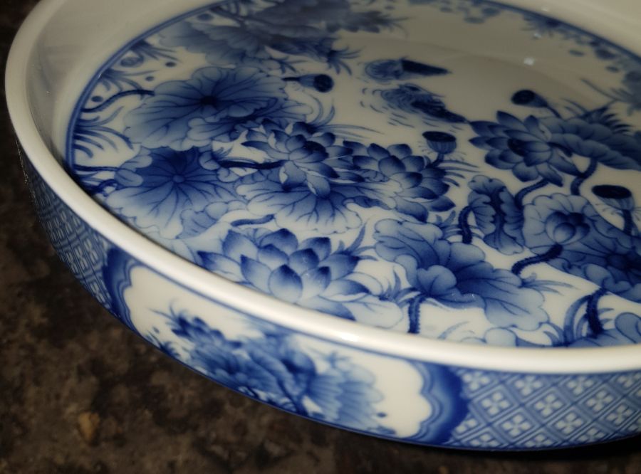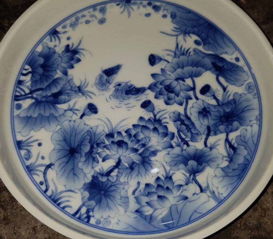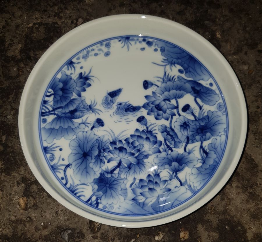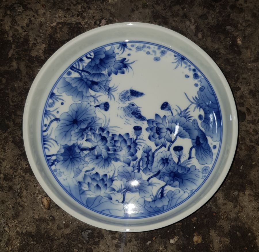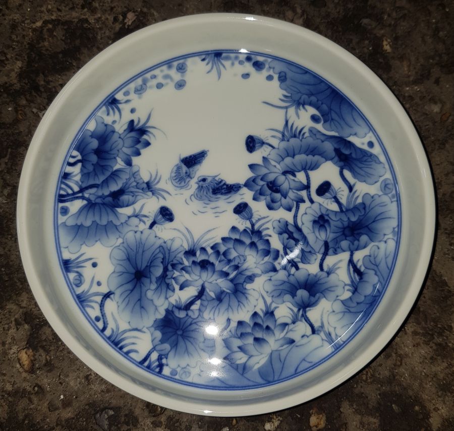 Khay sứ họa pháp Liên Áp ( Sen vịt ) mem lam chàm hồi cuốn hút. Đường kính 16.8cm. cao 3.5cm. GL680k