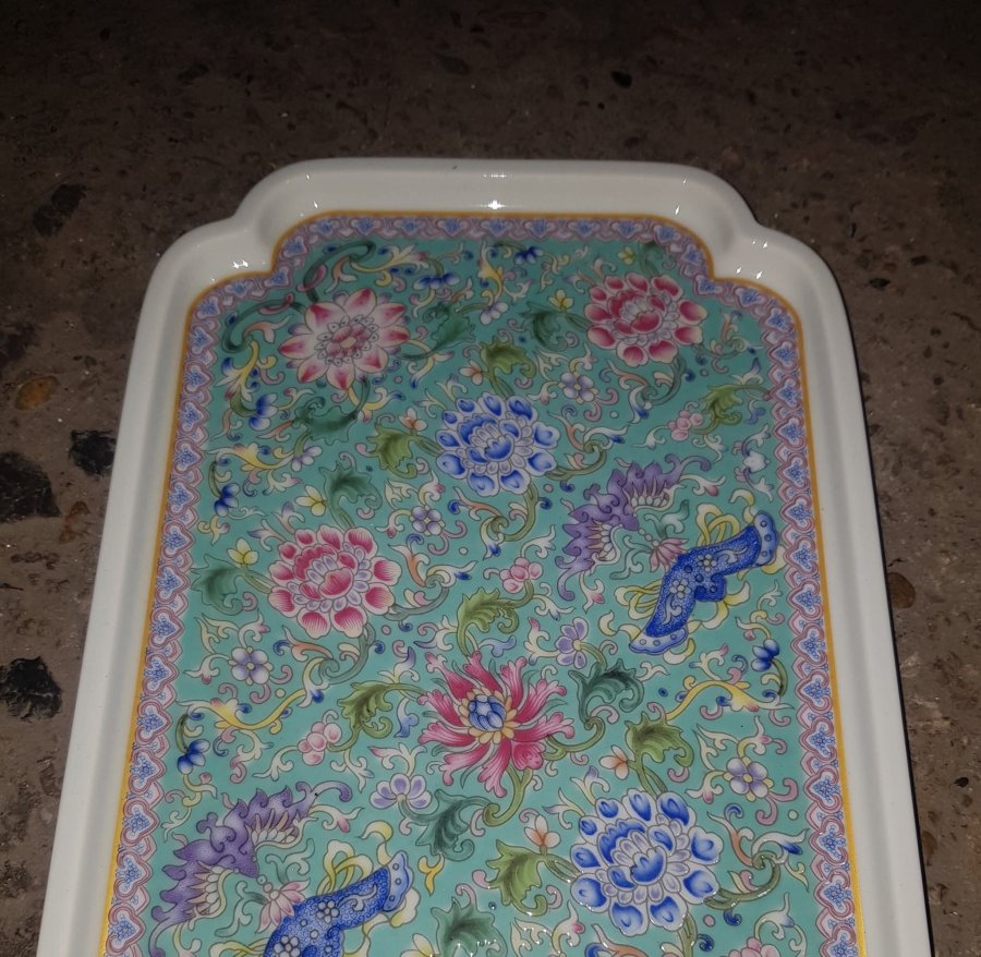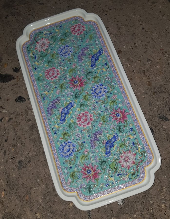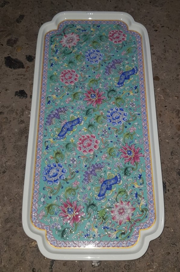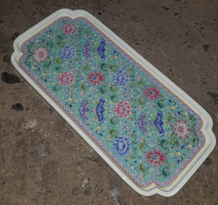Khay sứ họa tiết hoa sen sắc men ngũ thái có kích thước dài 36cm. rộng 17cm. lành lặn. GL680k