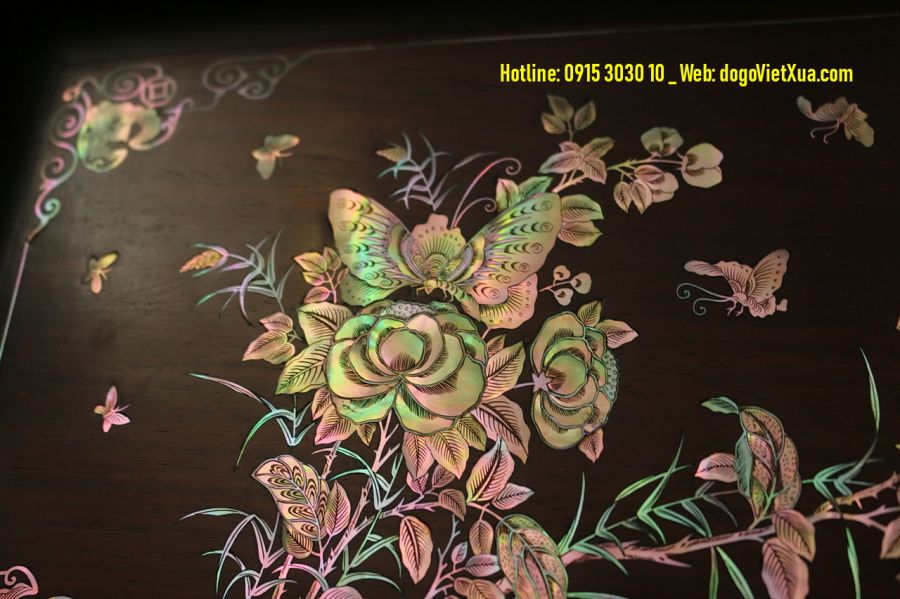 - Chất liệu: Gỗ trắc ta đỏ đen khảm Ốc đỏ lửa vàng chanh xanh thiên lý.