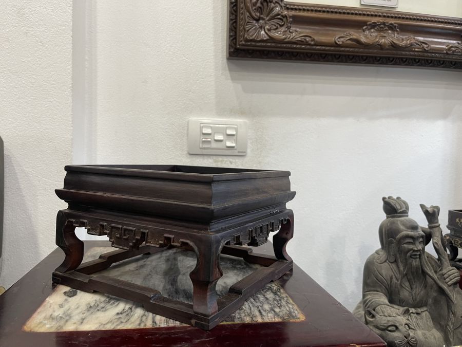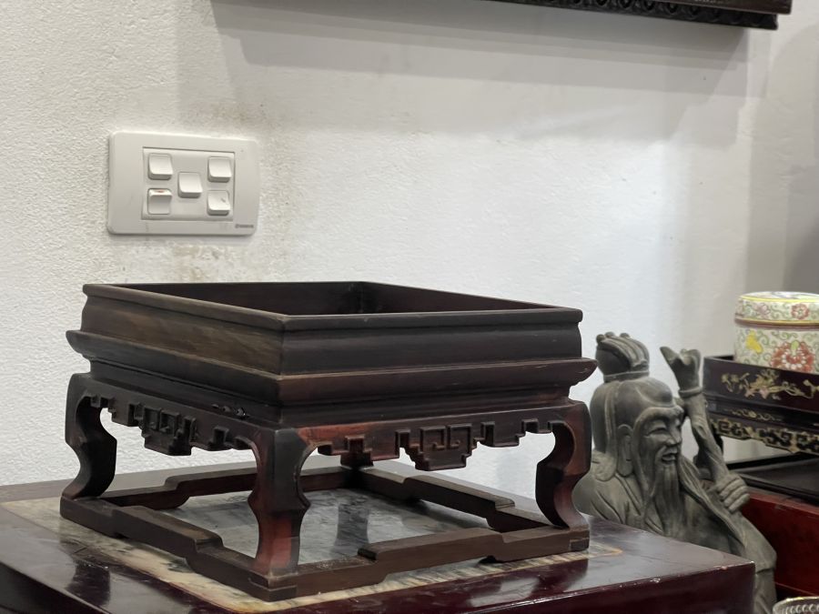 Thành vách dầy, gỗ trắc, hoa văn triện, dưới loe ra trên thu vào ( trên thu dưới quách)