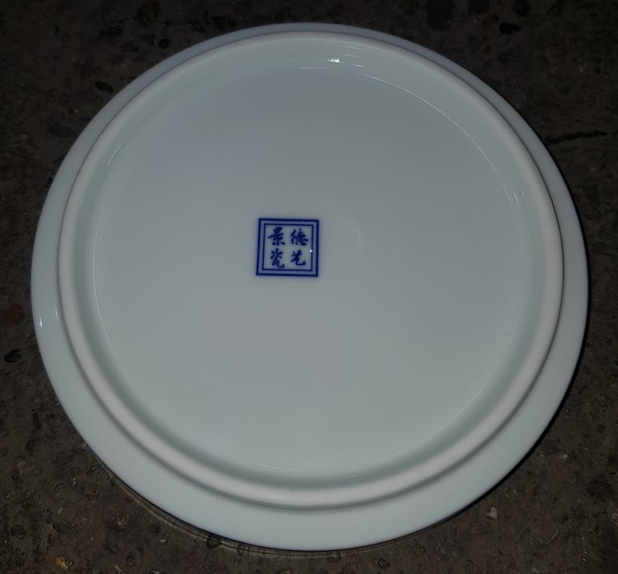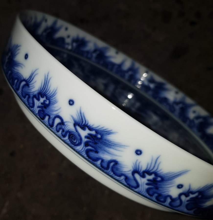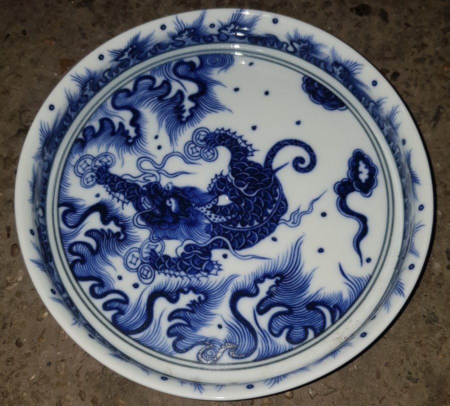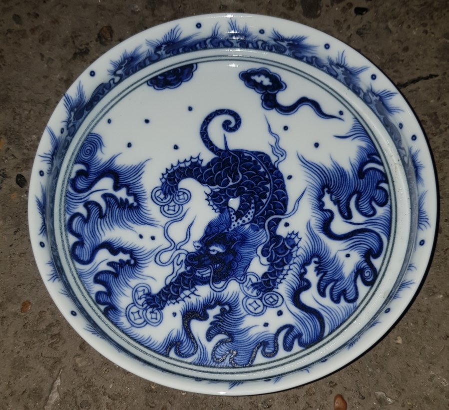 Khay trà sứ họa pháp Long Mã uy dũng với men lam chàm hồi nổi bật. Khay có đường kính miệng 16.5cm. cao 3.5cm. GL860k
