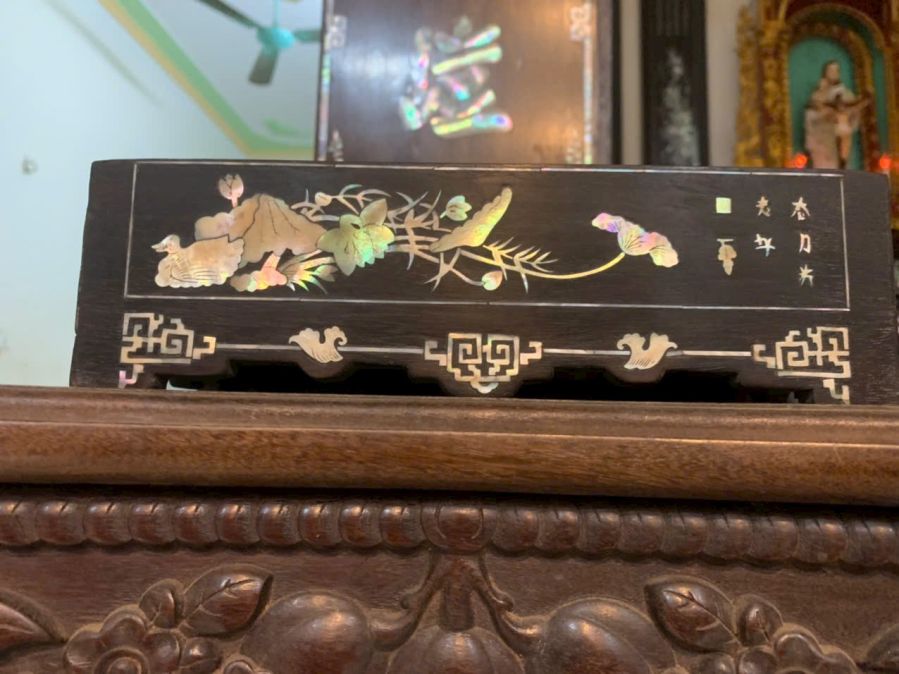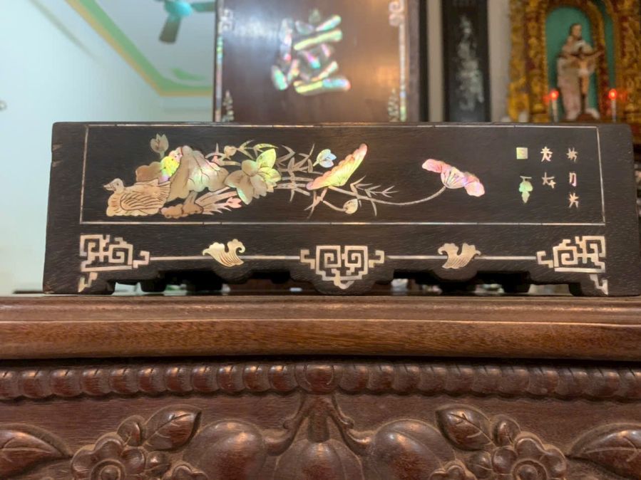E bán chiếc khay khảm ốc gỗ gụ vuông 25cm cao 11cm hàng đã qua sử dụng, mời các bác ạ