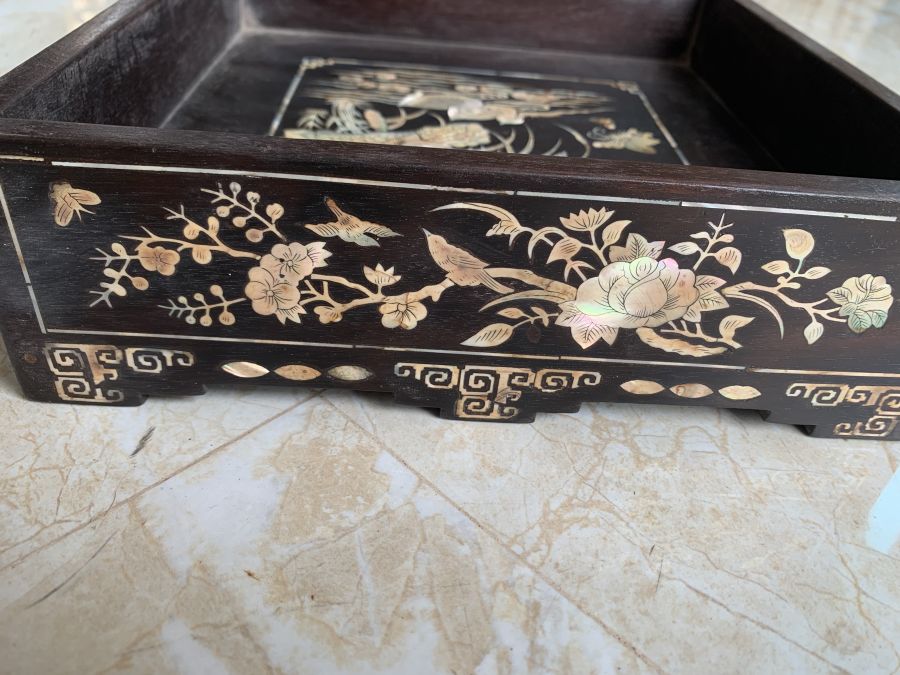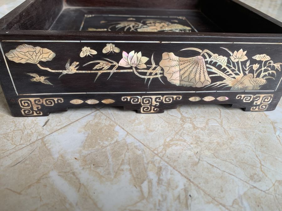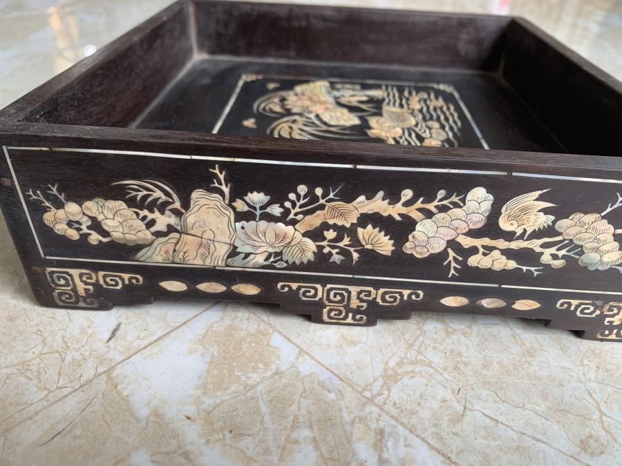 Khay vuông 25cm tích sen vịt gỗ gụ cẩn ốc xưa giá 2.100.000đ