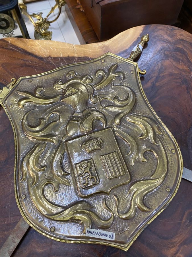 Chất liệu: Khiên và tay cầm kiếm bằng đồng, thân kiếm bằng sắt (hàng xưa decor không có lưỡi).