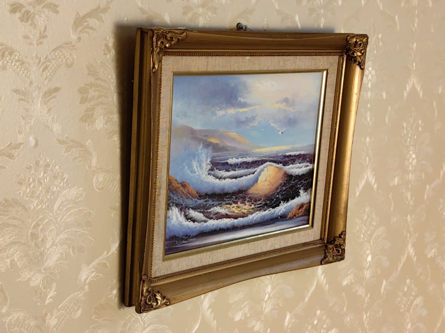 Khoảnh khắc sống động: Bức tranh khắc họa hình ảnh những con sóng bạc đầu cuộn trào, vỗ mạnh vào ghềnh đá giữa ánh chiều tà. Sự kết hợp giữa gam màu xanh thẳm của nước biển và sắc trắng tinh khôi của bọt sóng tạo nên một khung cảnh đầy năng lượng.