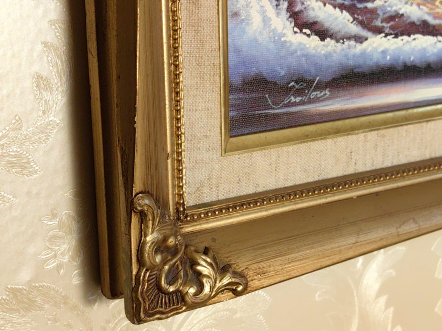 Khung gỗ sang trọng: Bộ khung mạ vàng với hoa văn cổ điển tôn lên vẻ quý phái, biến bức tranh thành một món đồ trang trí đẳng cấp.