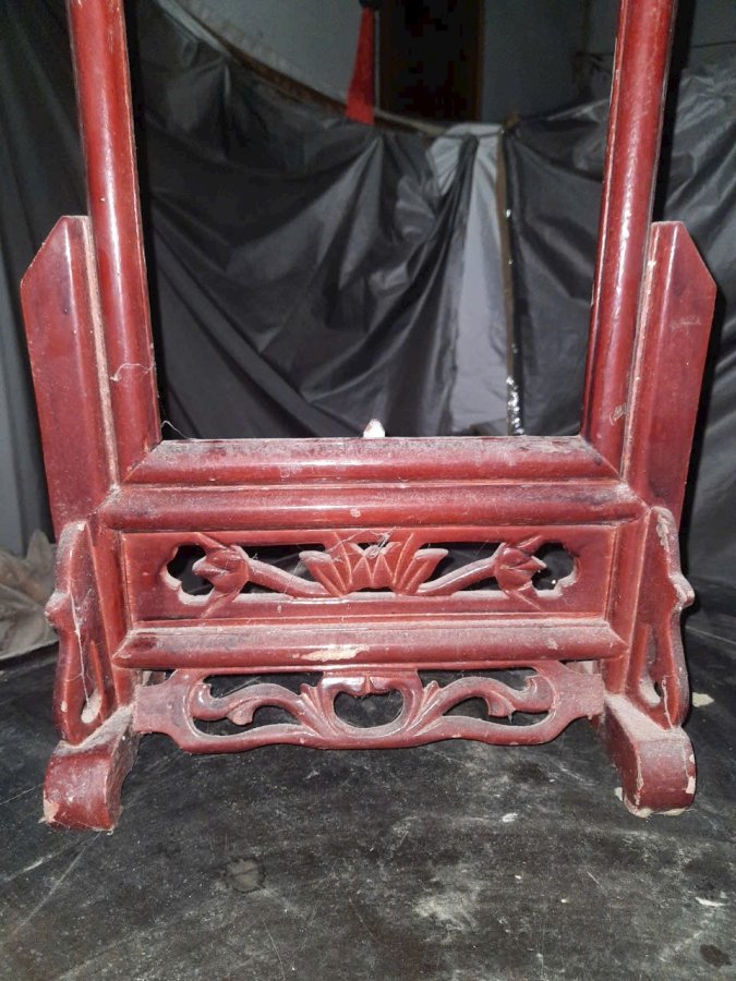 Chiếc khung tranh gỗ có hoa văn đẹp. Cao 57cm. Rộng 30cm tính cả đế. Dùng trưng tranh thủy mặc hay mỹ nhân cũng hay