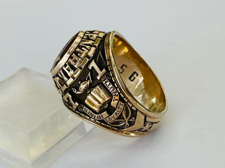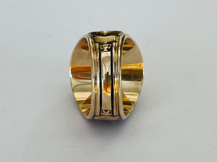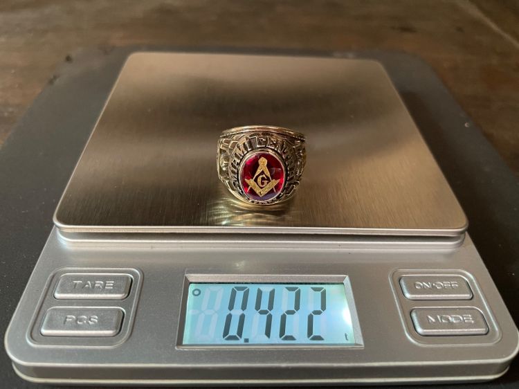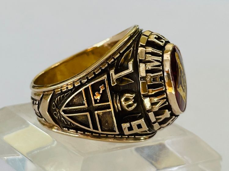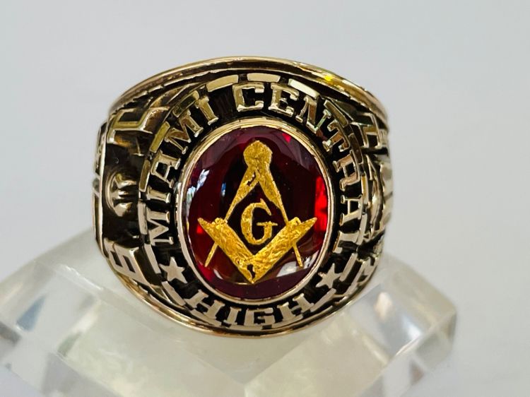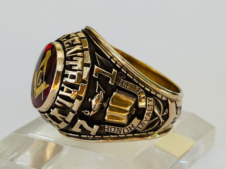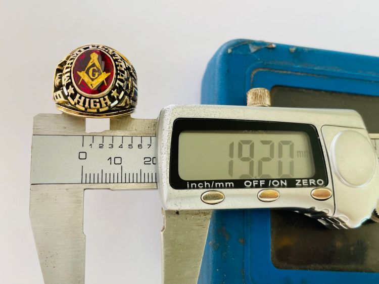 Kính phố vàng 10k. 1971 Hột đỏ huyết trơn logo Masonic dát vàng tuyệt đẹp. Size:19