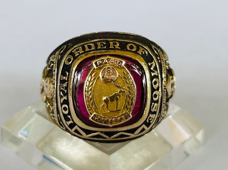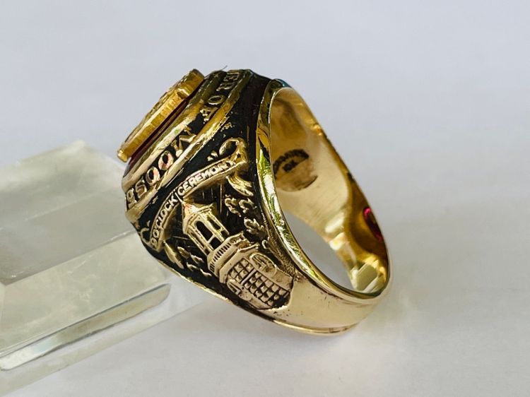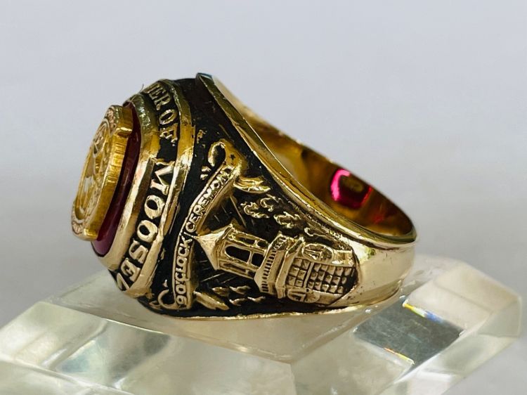 Kính phố vàng 10k. Trường công giáo xưa ***** lõm. Hột đỏ huyết logo dát vàng tuyệt đẹp.