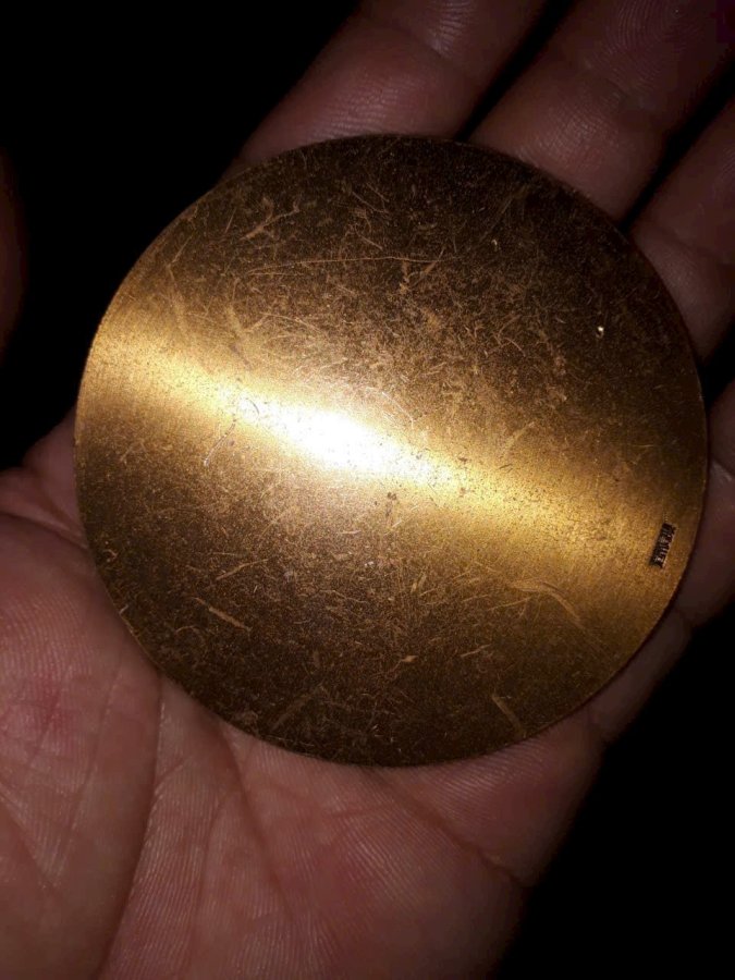 Chất liệu đồng mạ vàng. Dập nổi hình chùa bên hồ nước ở tp okyto.