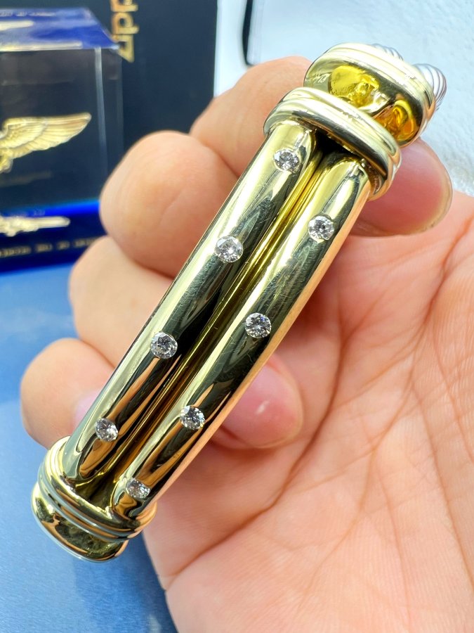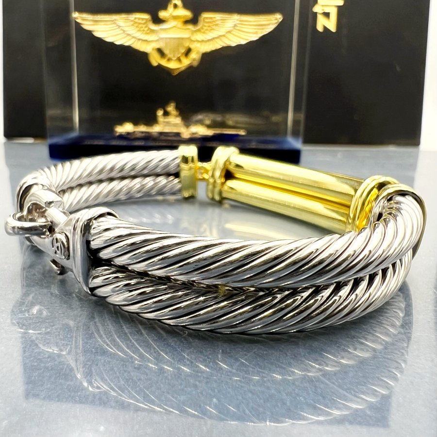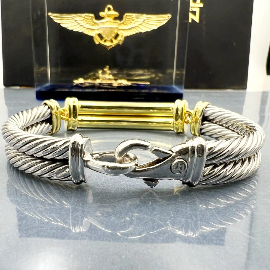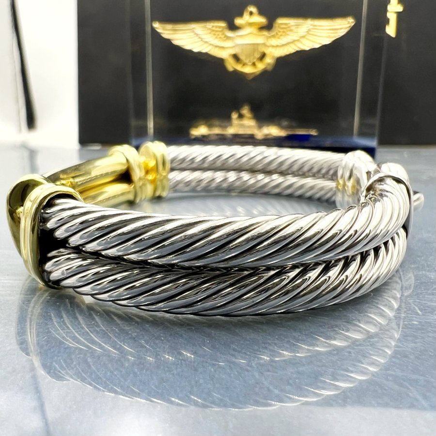 Lắc bạc 925 và vàng 14k hiệu david yurman mới tinh phôm bự hoa văn sắc nét đính 8v soàn thiên nhiên 2li rất đẹp, dây dài 19cm - bản ngang 12mm, nặng 42.9gram (11.44 chỉ), hơn 4.5 chỉ vàng 14k, hãng đang bán 4100* hơn 107tr chưa ship, em giao thông 48tr❤️