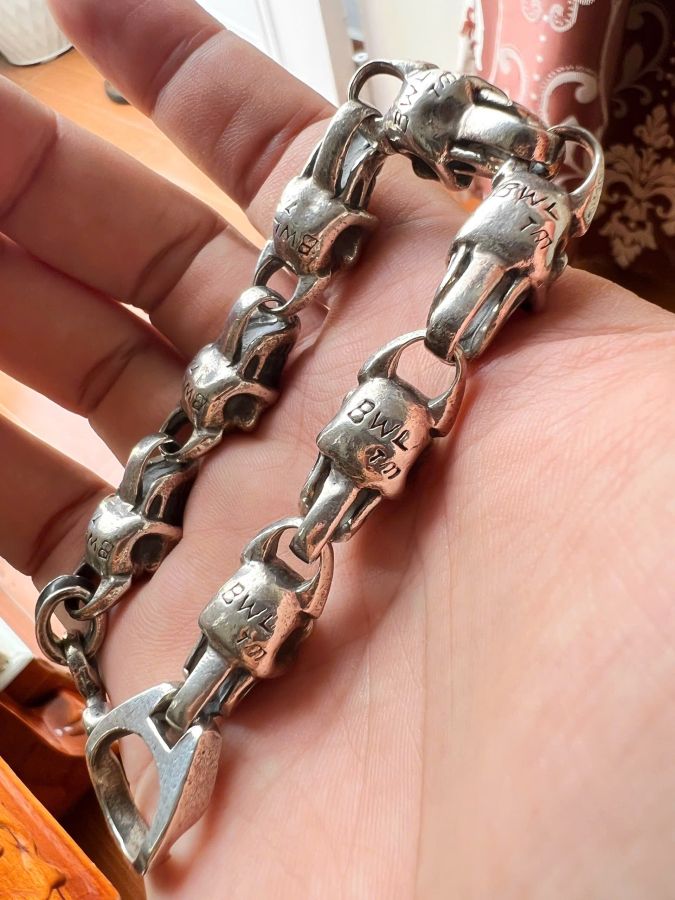 Lắc đầu lâu bạc 925 hiệu BWL hoa văn sắc nét khóa gài rất đẹp, dây dài 22cm - bản ngang 12mm, mặt khóa 18mm, nặng 113.2gram (30.2 chỉ)