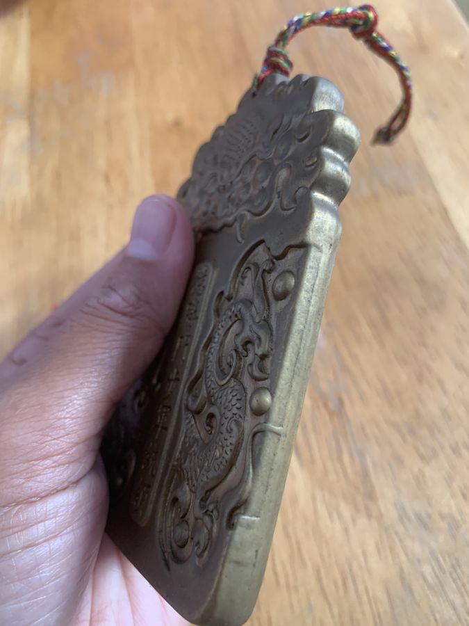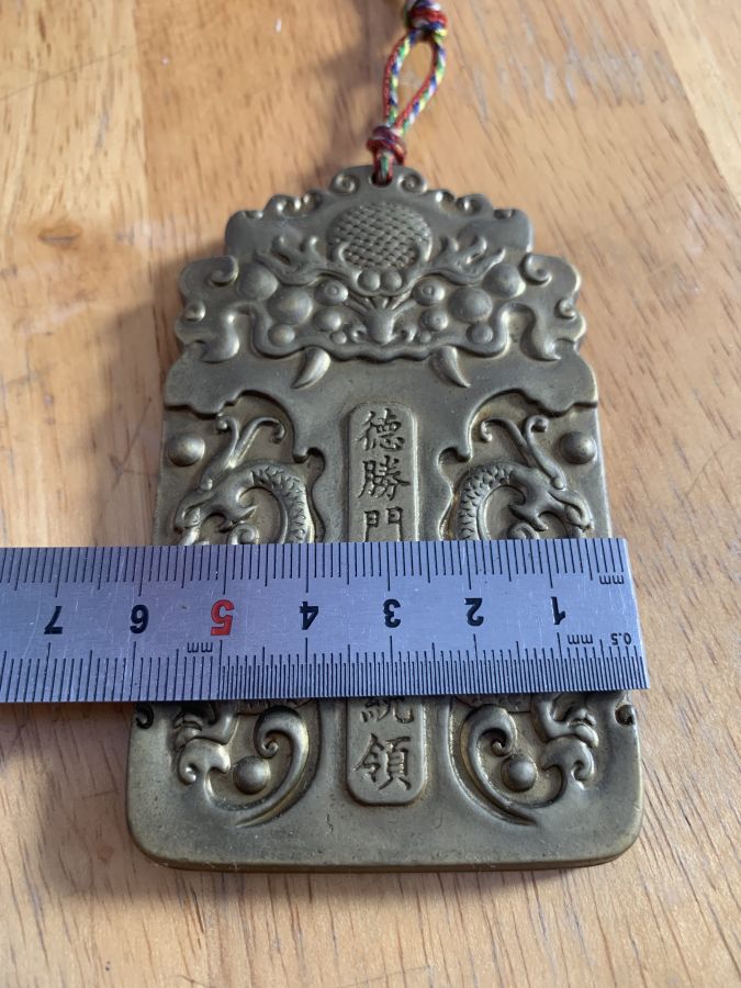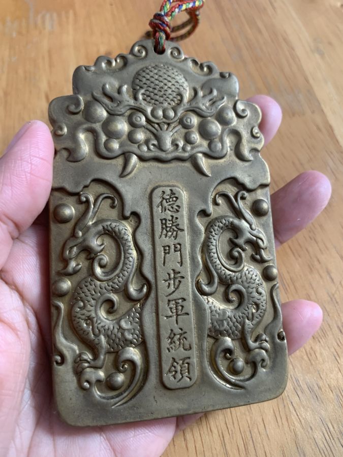 lệnh bài song long đồng cũ như trong hình, chạm khắc sinh động. kích thước 10cmx6cm nặng 315g thích hợp trưng bày sưu tầm.