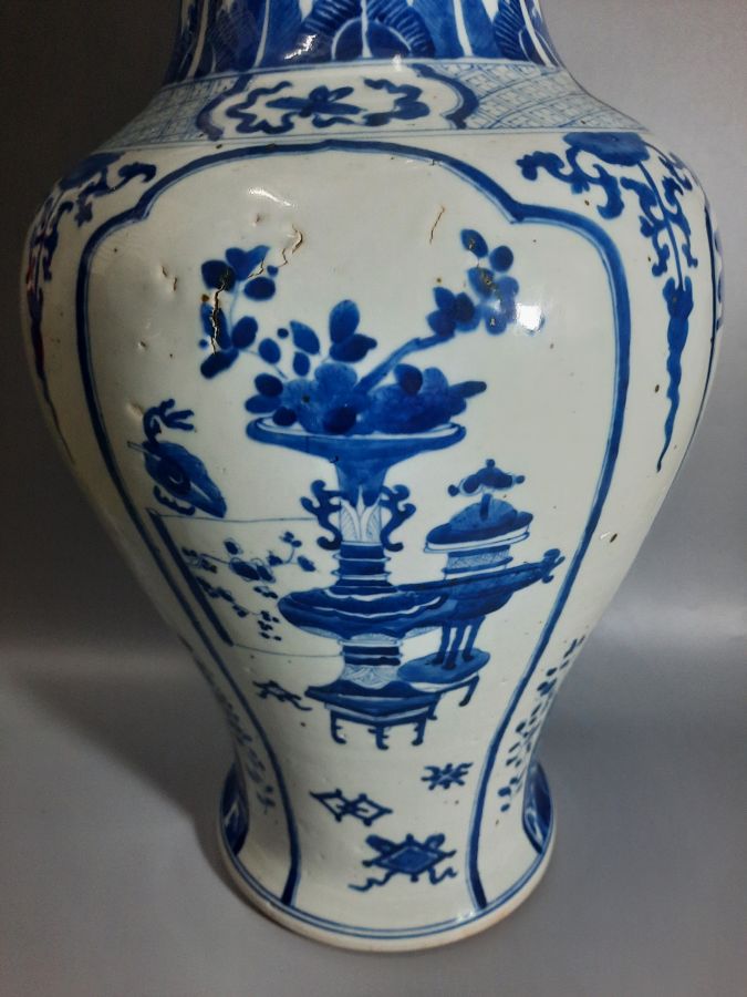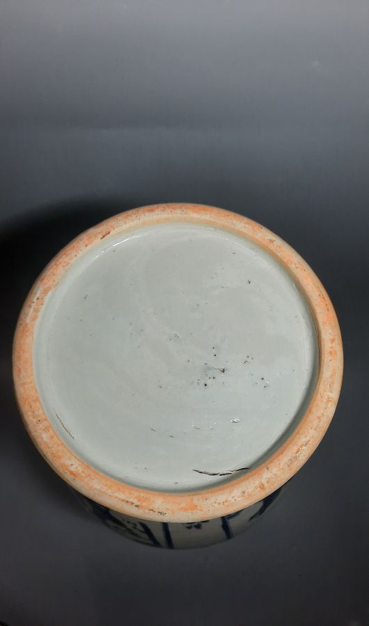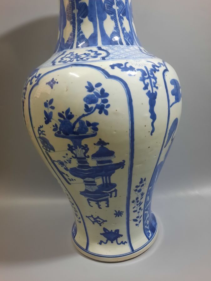 Lọ men trắng xanh vẽ đề tài lân hý nguyệt & cổ đồ cao 59cm , toàn lành.
