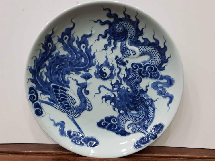 Đĩa Tàu xưa đắp nổi trong ngoài tích Long Phụng Chầu Nhật và Cuốn Thư tuyệt đẹp, hiếm gặp.