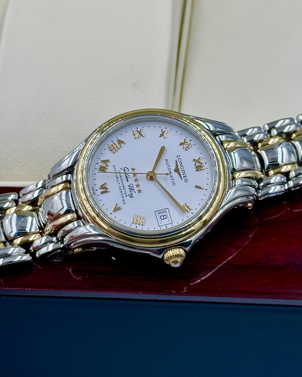 Siêu phẩm cực hiếm Longines Goldenwing Automatic Chronometer 18K/SS size 36mm. Sử dụng máy tự động Longines Chronometer nguyên zin hoạt động siêu mượt, chất liệu vỏ Stainess Steel, niềng vàng đúc 18K, dây Demi cẩn vàng 18K, kim cọc số vàng 18K nguyên zin. Kính Saphire chống xước. Tình trạng nguyên zin cực đẹp. E giao lưu chỉ ĐÃ BÁN