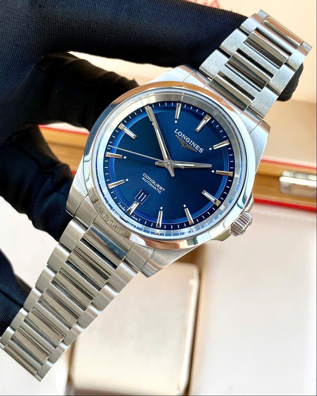 Longines Conquest L38304026 nổi bật với mặt số xanh blue, vỏ và dây đeo thép không gỉ
