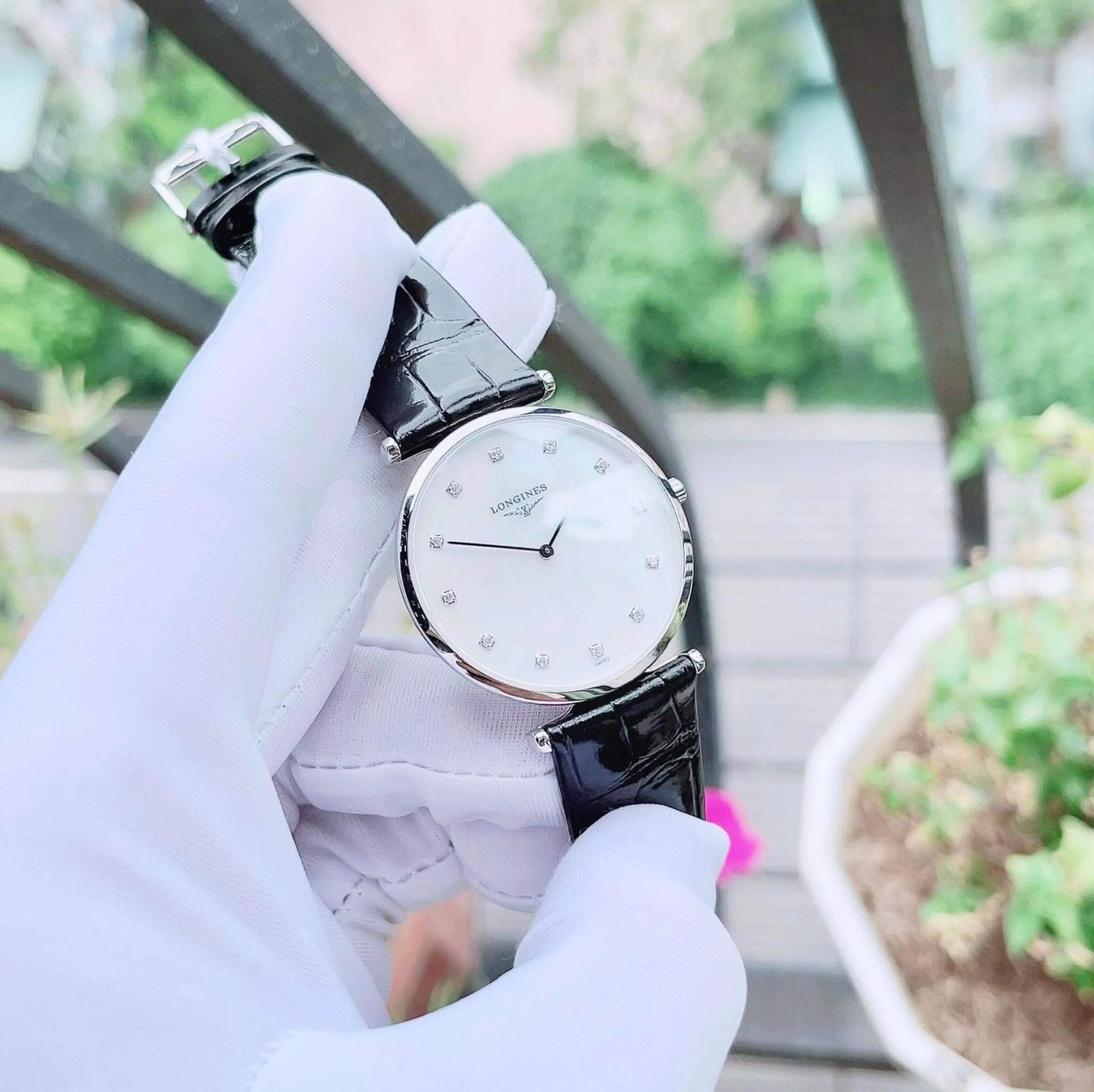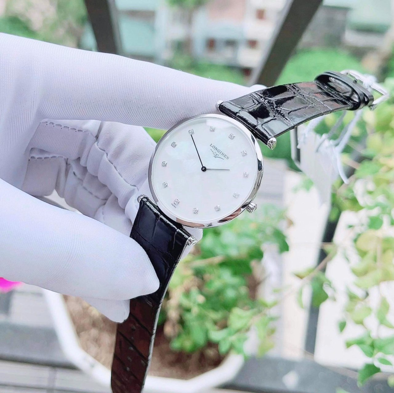 Longines La Grande Classique L4.709.4.88.2 (L47094882) nền mặt số khảm trai óng ánh chuyển sắc theo từng góc nhìn, kết hợp hài hòa với cọc số kim cương lấp lánh mang đến vẻ đẹp trang nhã nhưng đầy cuốn hút.