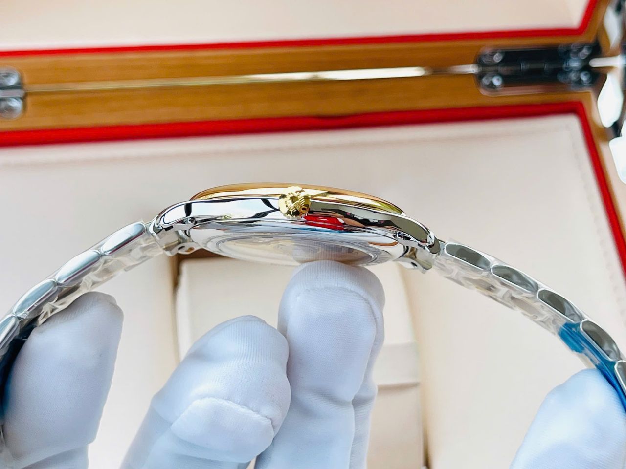 - Vỏ được làm bằng thép chống ghỉ 316L. viền được làm bằng bọc vàng 18k dày 200 micro