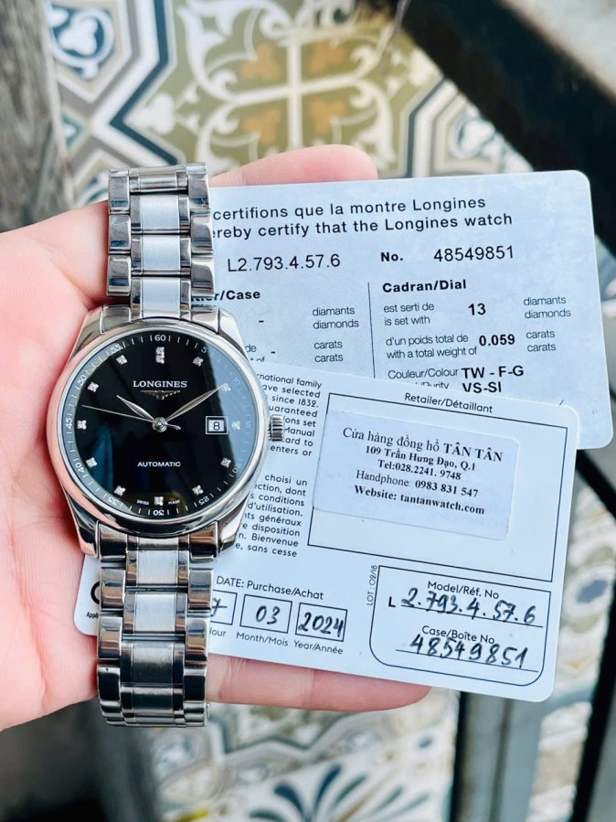 Longines master L2.793.4Size 40mm cực hiếmCọc số đính 13v kim cương tự nhiênMáy l888 đời mới trữ cót 64 giờLike new full hộp sổ thẻ