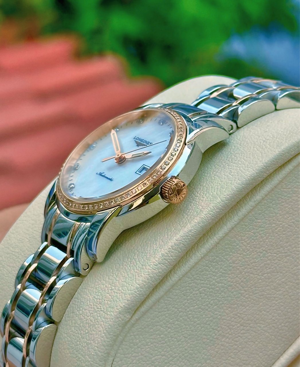 • Mặt số: Khảm trai trắng với kim cương, tạo điểm nhấn quý phái.