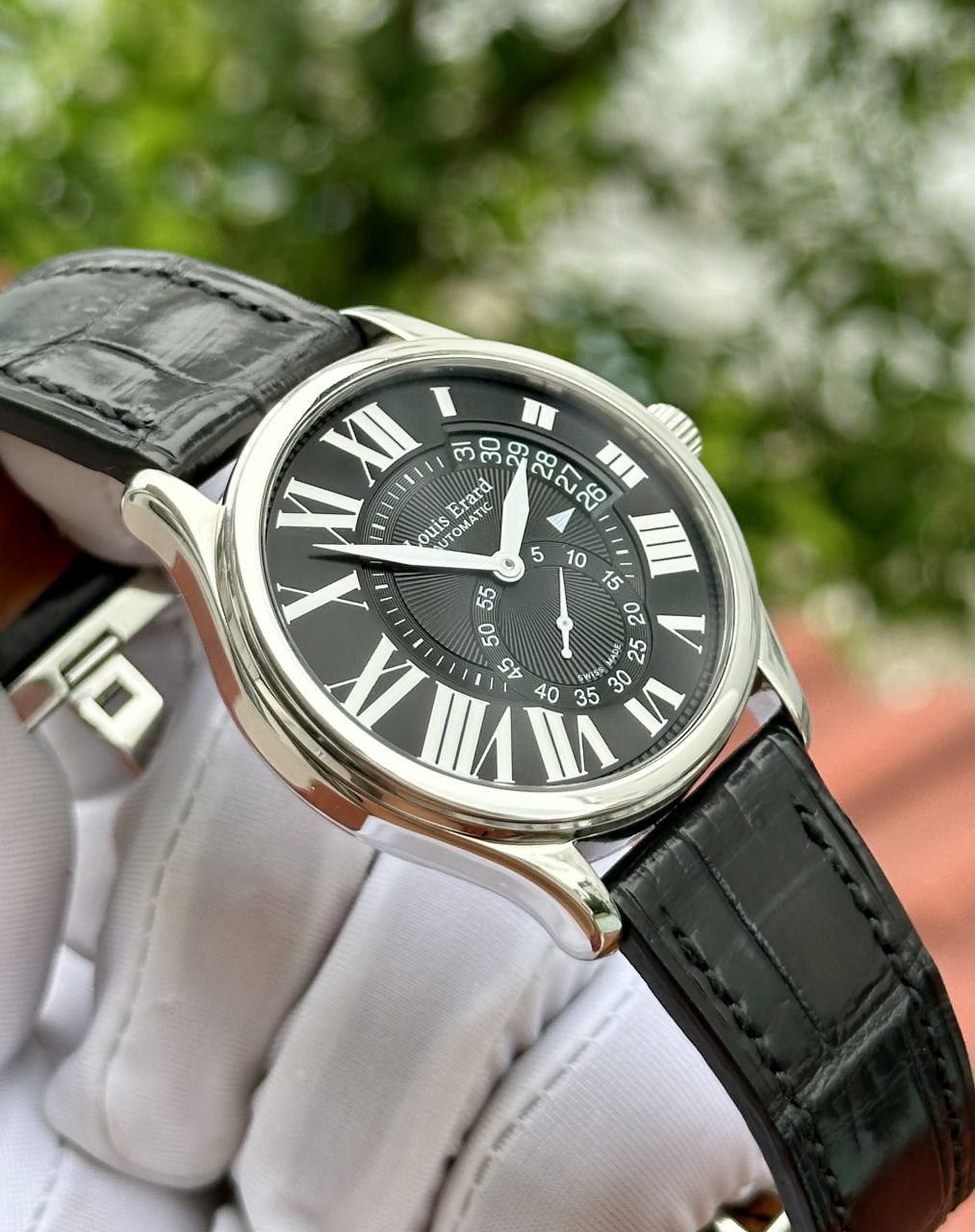 Đồng hồ Louis Erard 300 Automatic chính hãng Thuỵ Sỹ . Sử dụng máy tự động Thuỵ Sỹ 2895-2 27 chân kính dao động 28.800 nguyên zin chạy chuẩn, mặt số nguyên zin đẹp keng thiết kế tia siêu đẹp. Toàn thân thép Stainess Steel 316L sáng bóng, kính Saphire chống xước, chống nước 5ATM. Dây da handmade mới thay, khoá zin Louis Erard hãng. Size 40mm phù hợp mọi loại cổ tay. Mới 1700 đô ~ 42Tr, hàng đã qua sử dụng còn zin đẹp hoạt động tốt e giao lưu siêu tốt chỉ ĐÃ BÁN