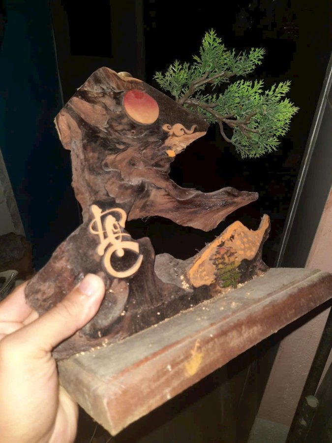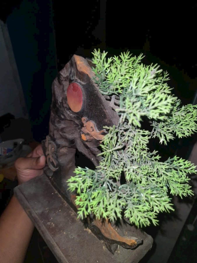 Tác phẩm lũa gỗ cẩm cắm đế xông trầm và cây tùng giả. Cao 26cm. Dùng xõng trầm cho thơm.