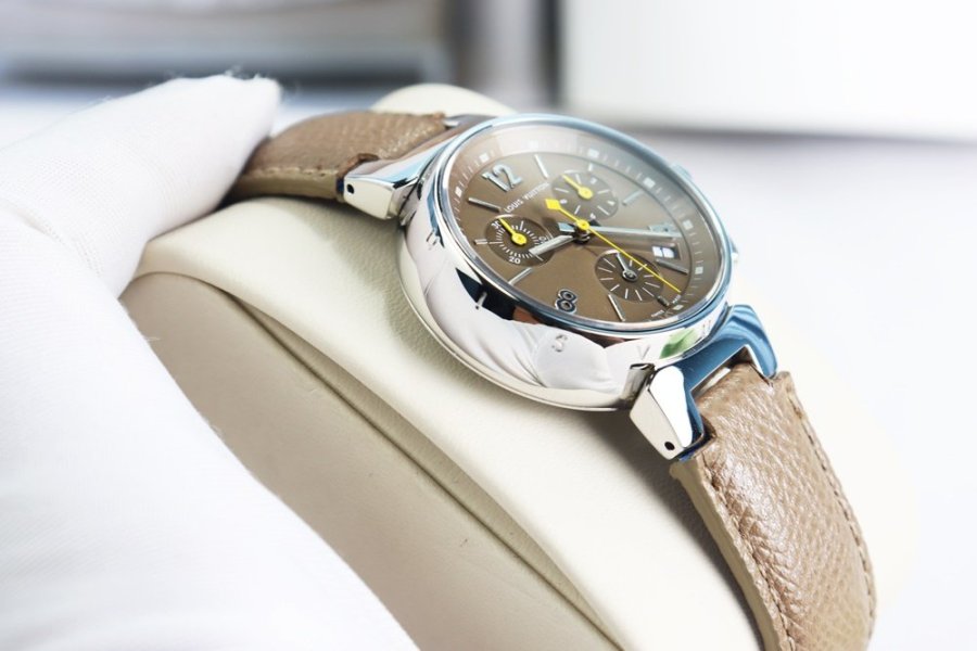 Tham khảo giá thị trường https://fr.vestiairecollective.com/accessoires-femme/montres/louis-vuitton/montre-louis-vuitton-tambour-chronographe-en-acier-camel-39964605.shtml