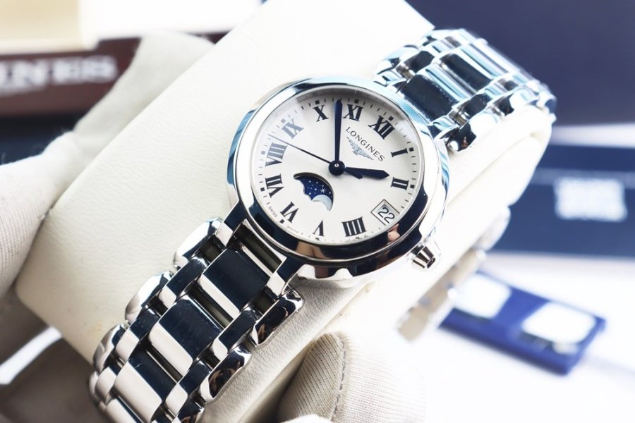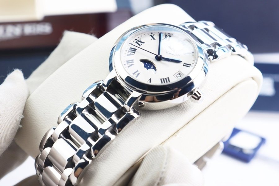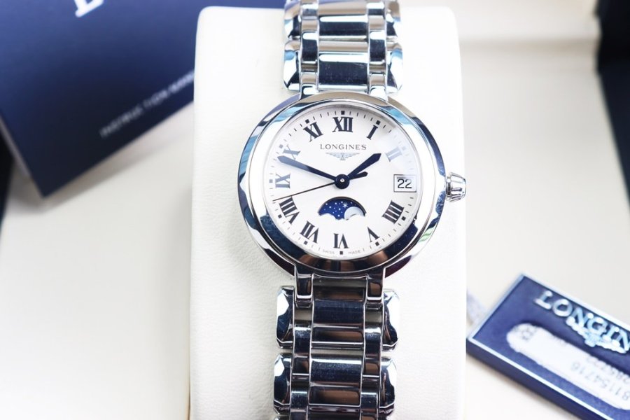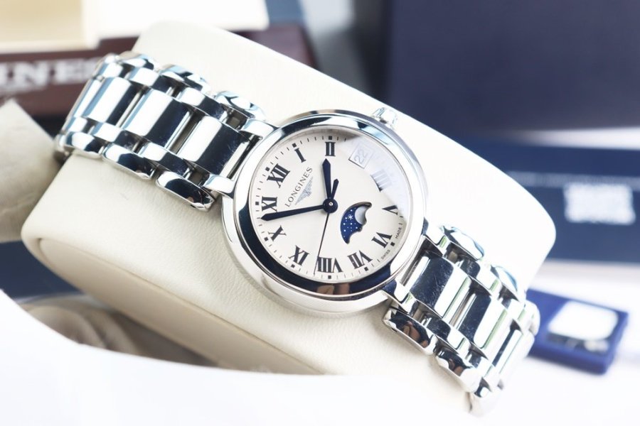 Primaluna Moonphase mang vẻ đẹp nữ tính đặc trưng của Longines với mặt trắng trang nhã, kim nung xanh nổi bật và cọc số La Mã cổ điển. Thiết kế thanh lịch, lên tay gọn gàng, phù hợp đeo hằng ngày hoặc những dịp trang trọng.