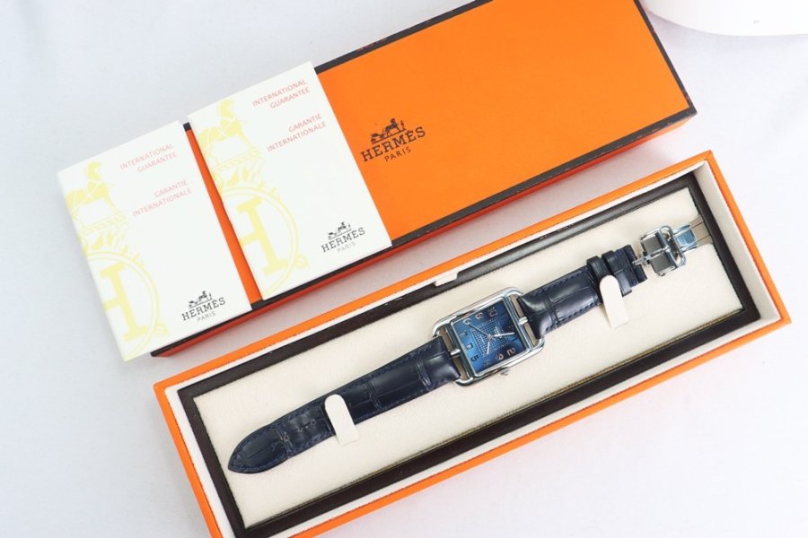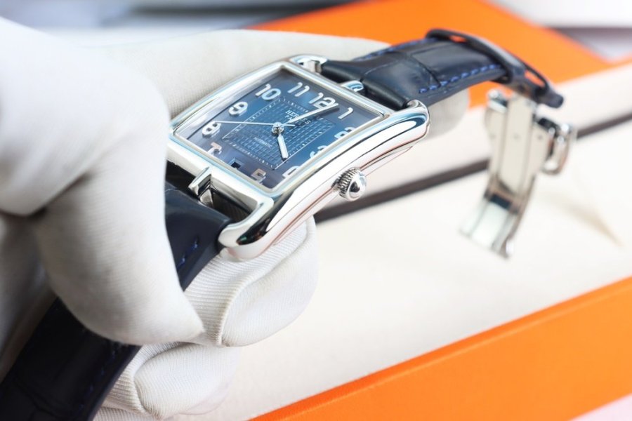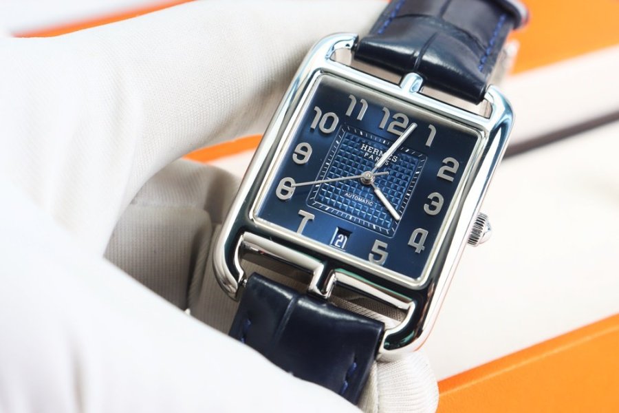 Mẫu Cape Cod biểu tượng của Hermès với thiết kế vỏ vuông bo mềm đặc trưng, mặt xanh navy sang trọng cùng cọc số học trò cổ điển – vừa khác biệt, vừa đẳng cấp khi lên tay.