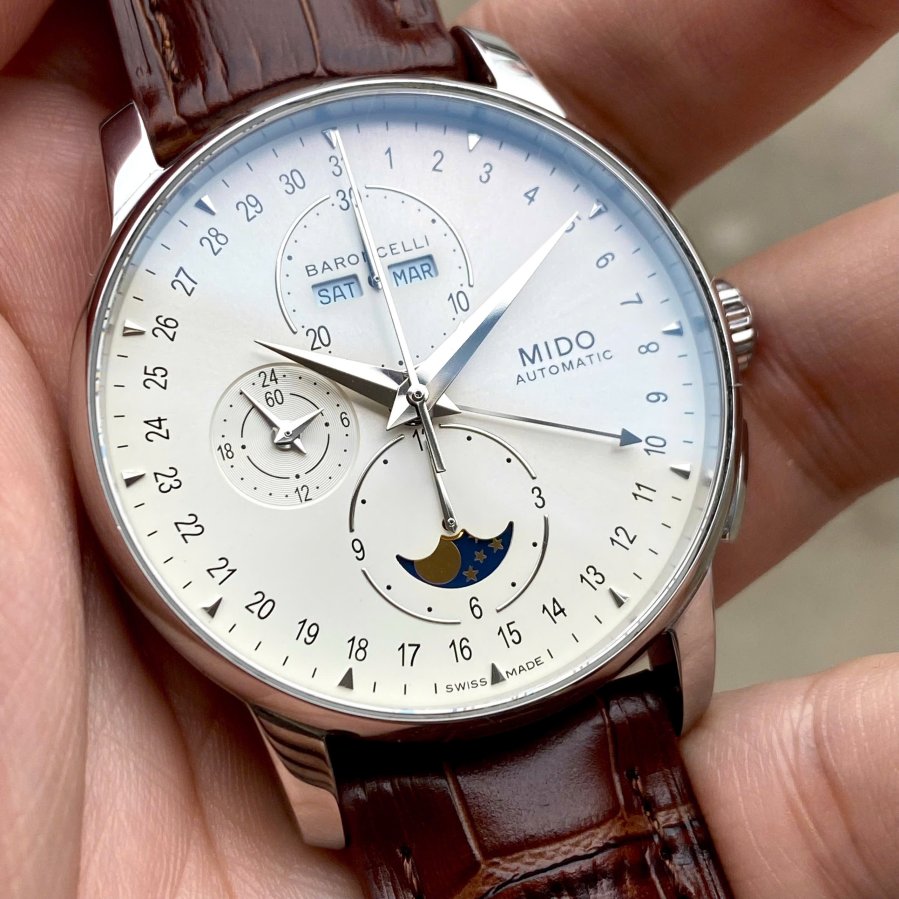 Mã cao cấp nhất của dòng baroncelli của Mido👉Full Chức năng : thứ , ngày, tháng, moonphase, kim 24h , chronograpSize 42mm👉Máy Cal 1321 ốc nung xanhPhiên bản siêu hiếm - hình thức cực đẹp