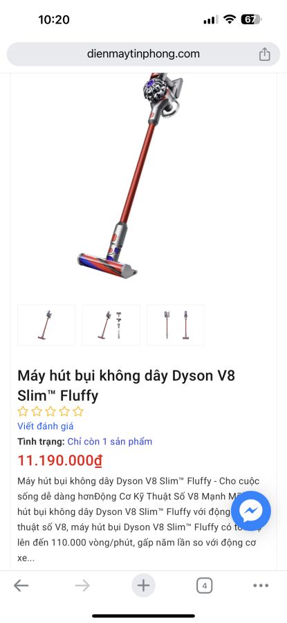 Gl ae e mây hút bụi cầm tay v8 dyson cực vip và đẹp lưới lọc moies tinh . Có 2 chế độ hút mạnh mẽ và tiết kiệm . Cục sạc còn nguyên nylon chưa tháo có đế treo tường luôn ạ . Vào nhà nhìn là thấy dang r . New tầm 11-12tr