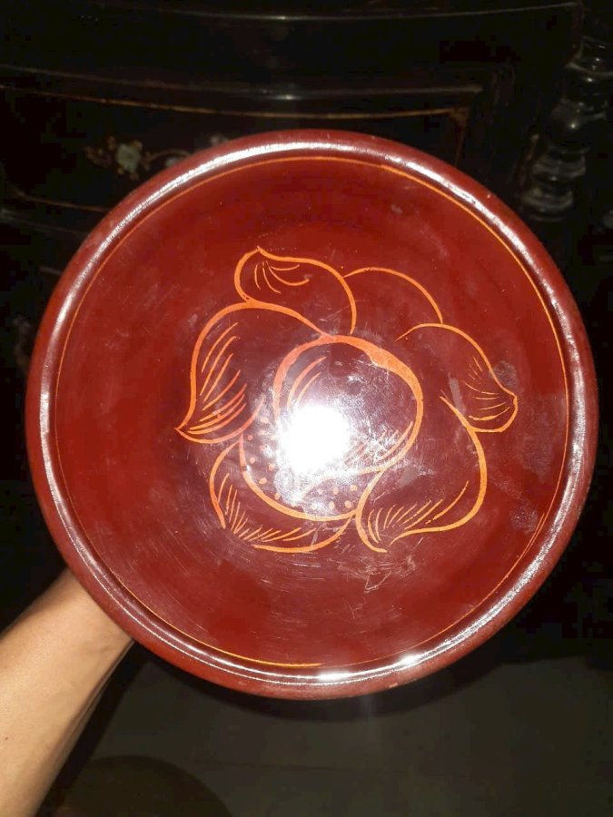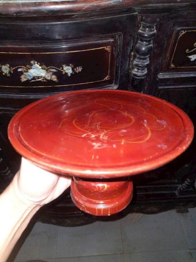 Mâm bồng gỗ mít thời xưa, sơn son vẽ vàng, đk 20cm. Cao 15cm. Lành đẹp.