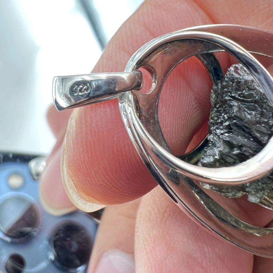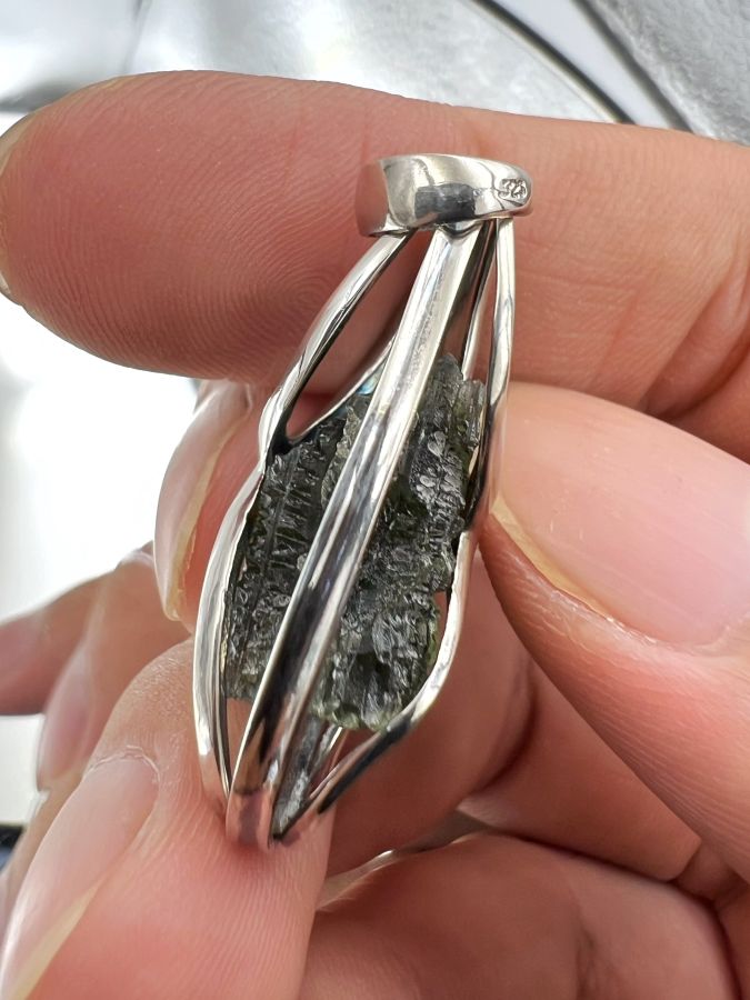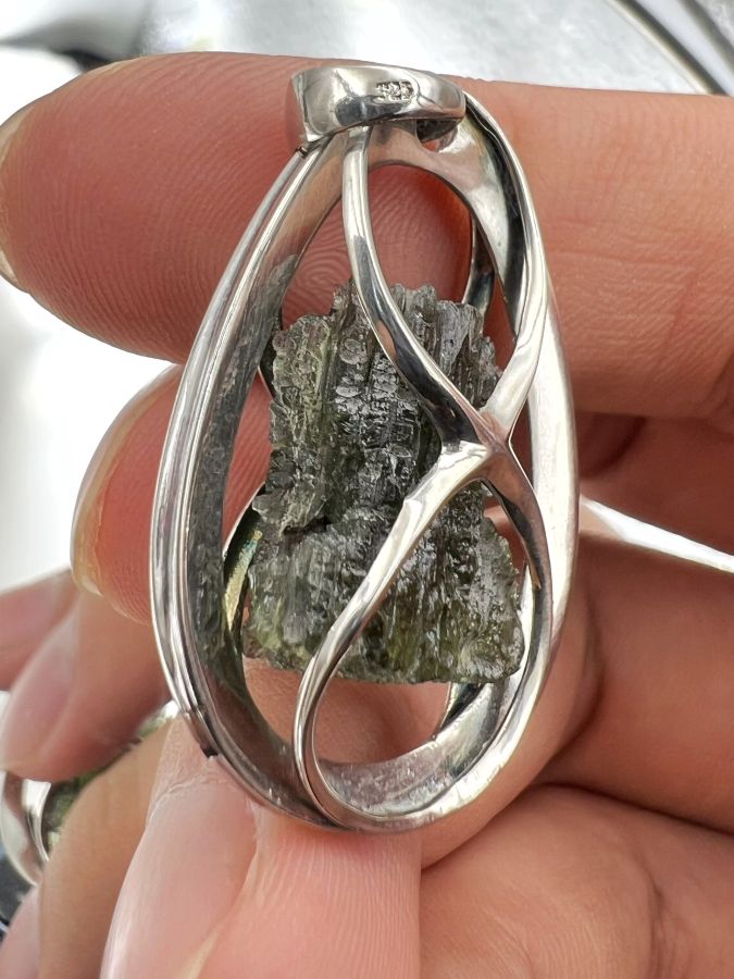 Mặt bạc 925 đính đá Moldavite rất đẹp, phôm bự, size 26x40mm, nặng 8.5gram (2.27 chỉ)