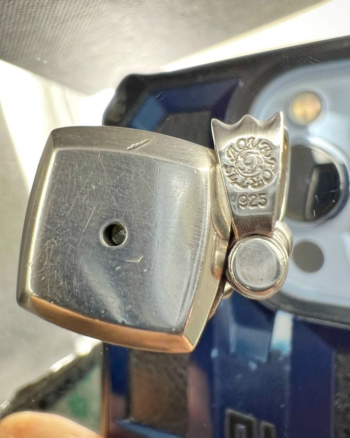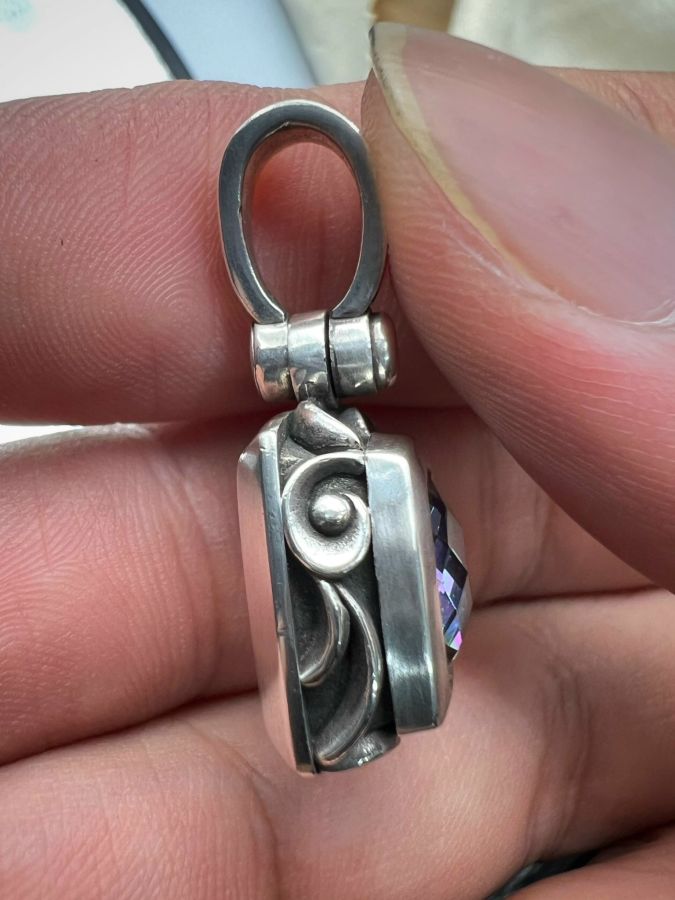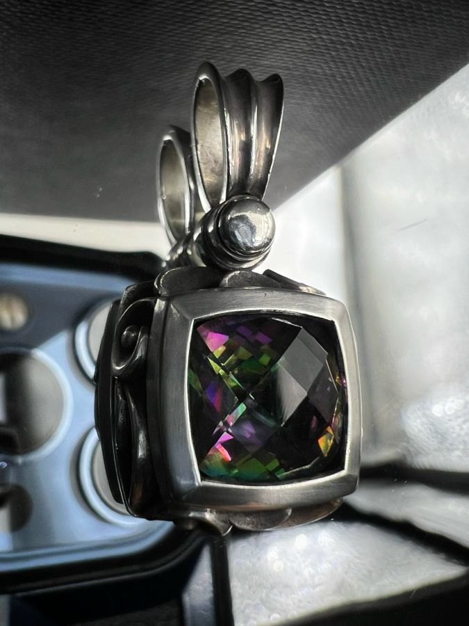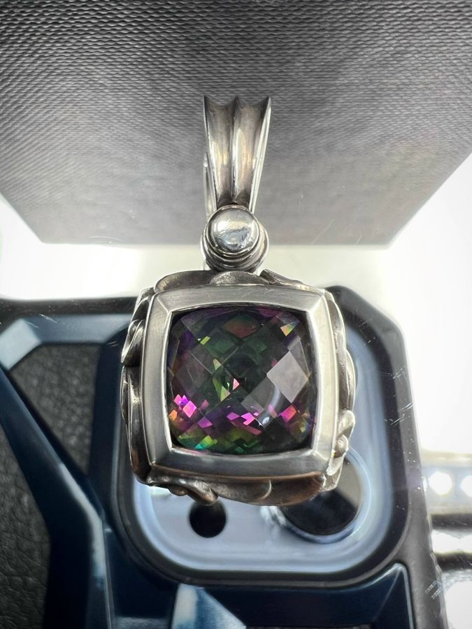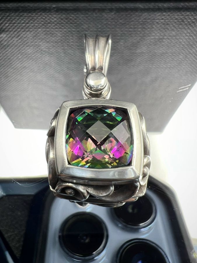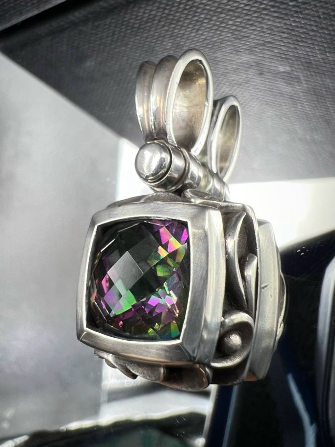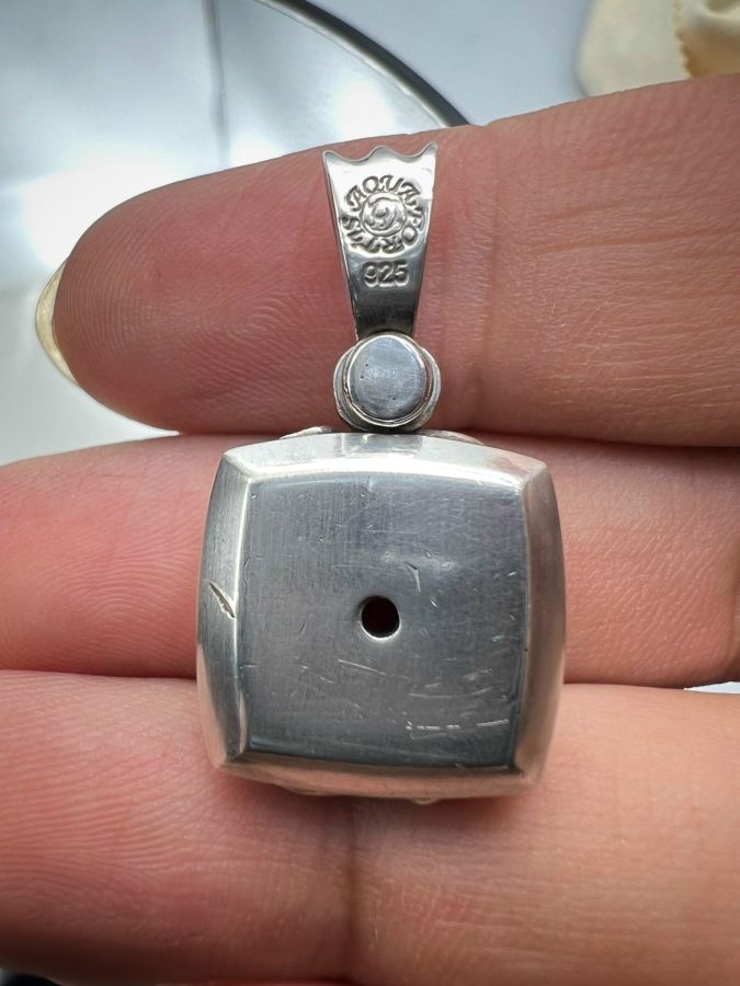 Mặt bạc 925 hiệu Aqua Fortis hoa văn sắc nét đính đá thạch anh ánh 7 màu rất đẹp, size 17x31mm, nặng 14gram (3.73 chỉ)