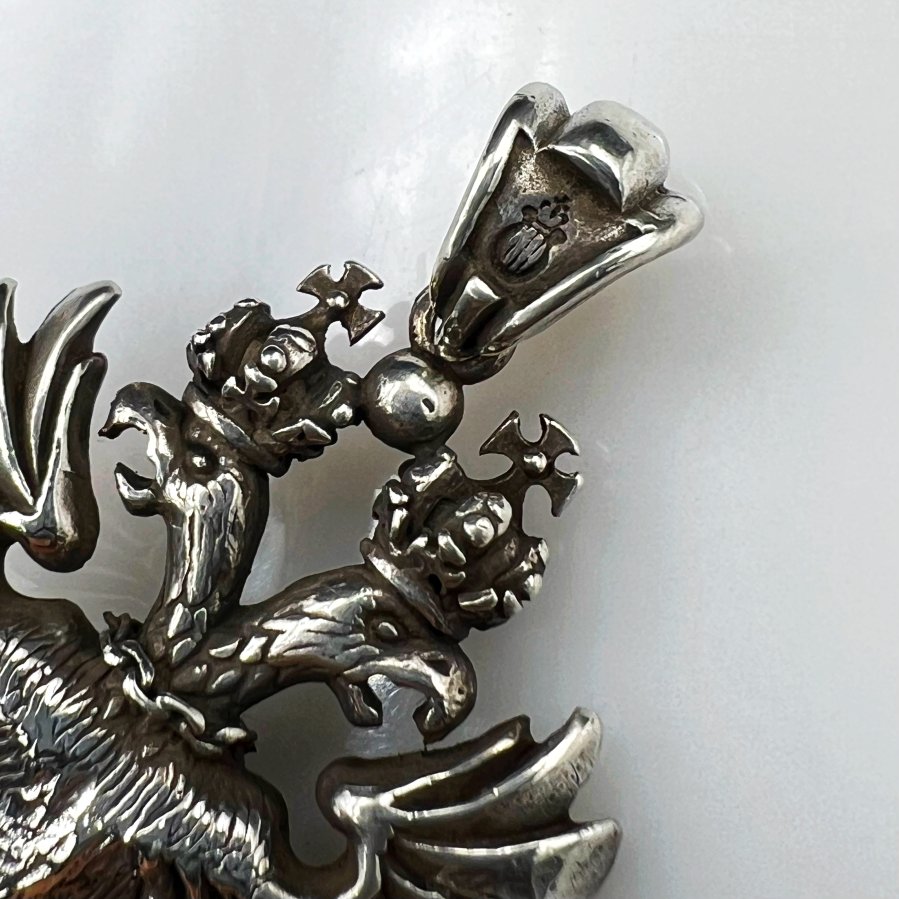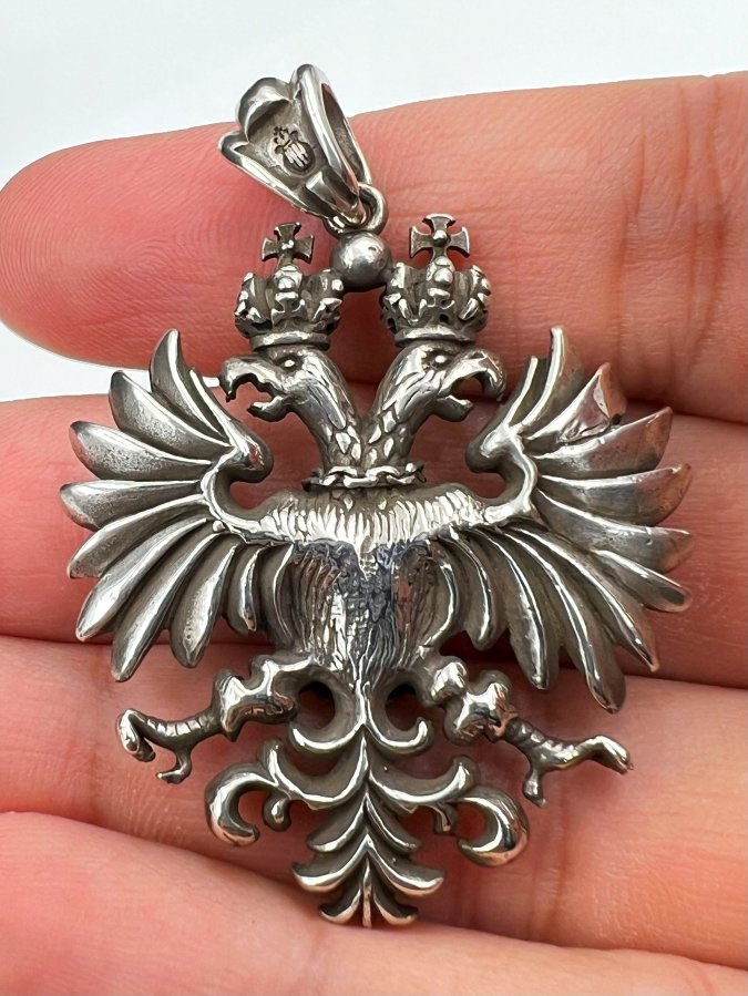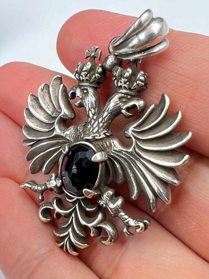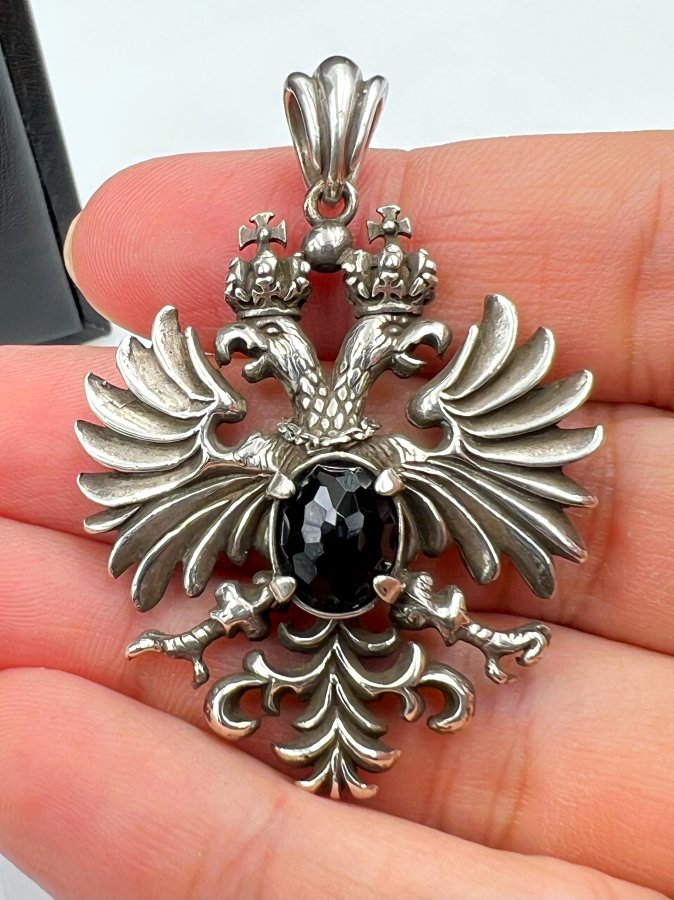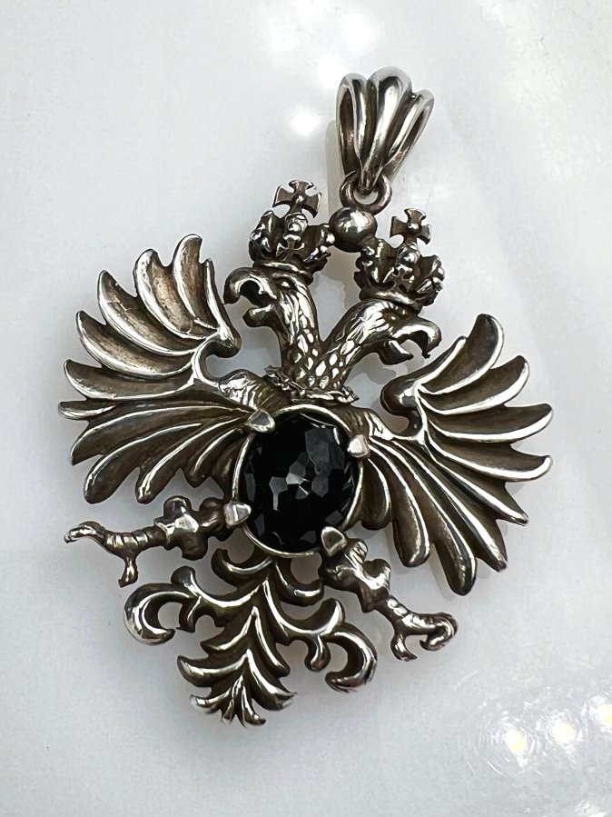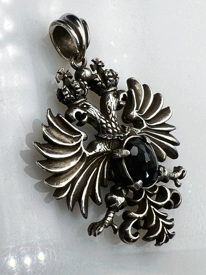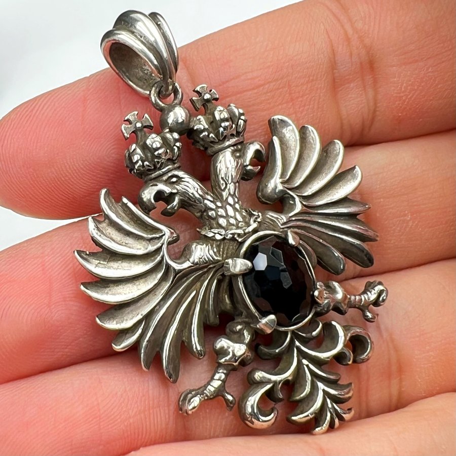 Mặt đại bàng 2 đầu bạc 925 hiệu Regalia mới tinh phôm bự hoa văn sắc nét đính đá onyx đen đa giác rất đẹp, size 38x53mm, nặng 24.63gram (6.57 chỉ), giao thông 5tr6❤️ Thiên 0923.12.6789