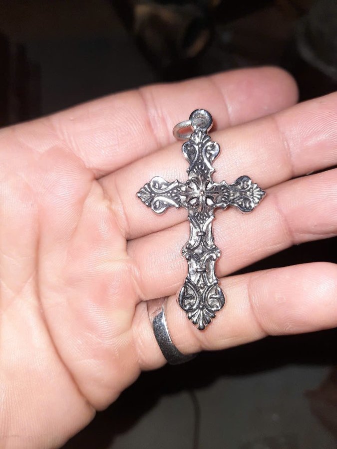 Mặt dây chuyền thánh giá. Chất liệu thép trắng hoa văn hoa lá tây rất đẹp. Dài 5,5cm.
