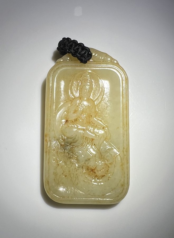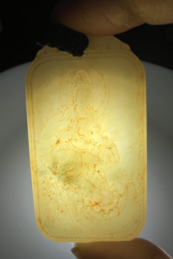Mặt dây đeo cổ chạm Bồ Tát Ngọc xưa cổ Cao: 6,4cm. Ngang 3,4cm. Dày : 0,68cm