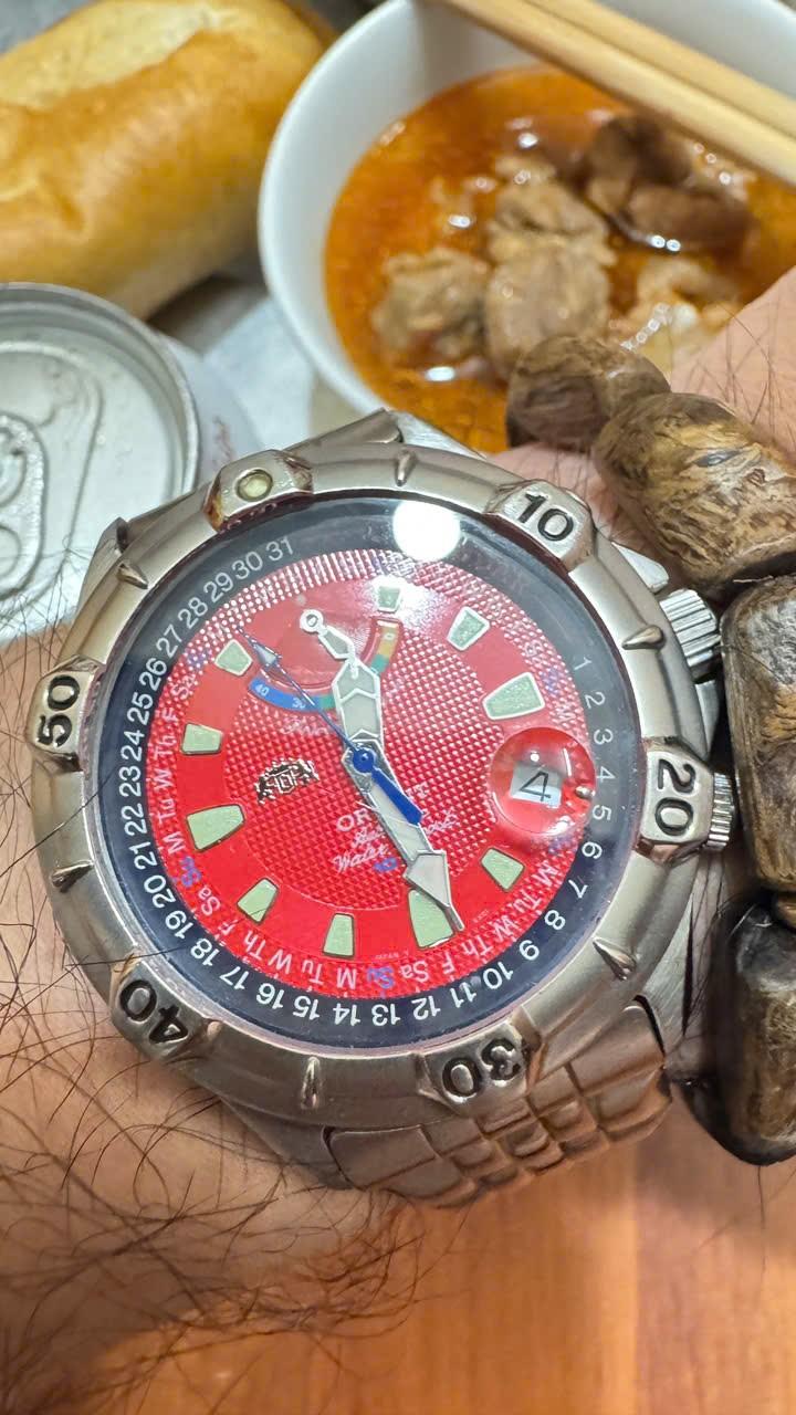 Orient automatic size 40 chính hãng 4 kim báo xăng mặt đỏ đẹp keng bác nào quan tâm alo đt 0842801111