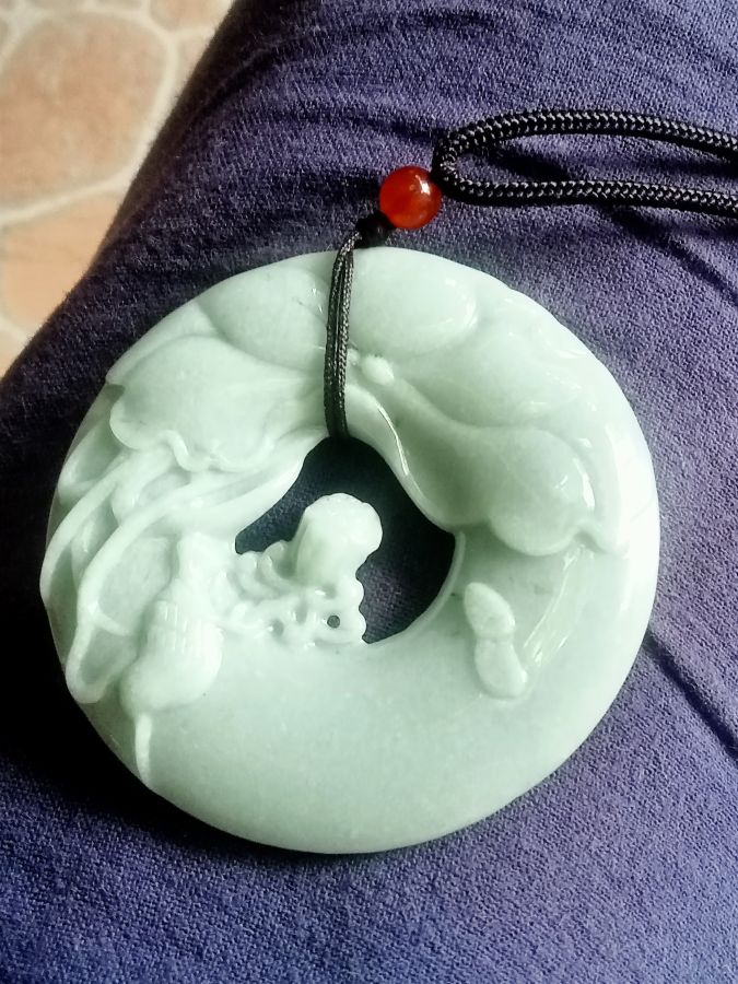 Mặt đồng điếu cẩm thạch chạm sen jade A kt : 58x9,6 mm nặng 54 gram tức là hơn 250ct giá 800k