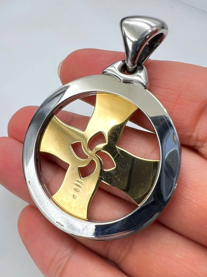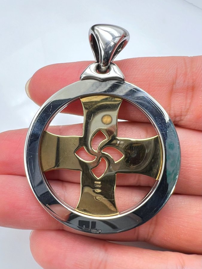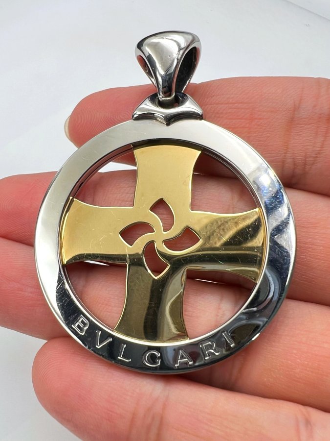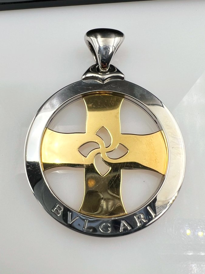 Mặt Tondo Cross hợp kim và vàng 18k đemi 2 màu hiệu BVLga.ri mới tinh hoa văn sắc nét rất đẹp, size 44x59mm, nặng 24.7gram (6.59 chỉ), hãng đang bán mới 4722* ~ 125tr, em giao thông 32tr❤️ Thiên 0923.12.6789