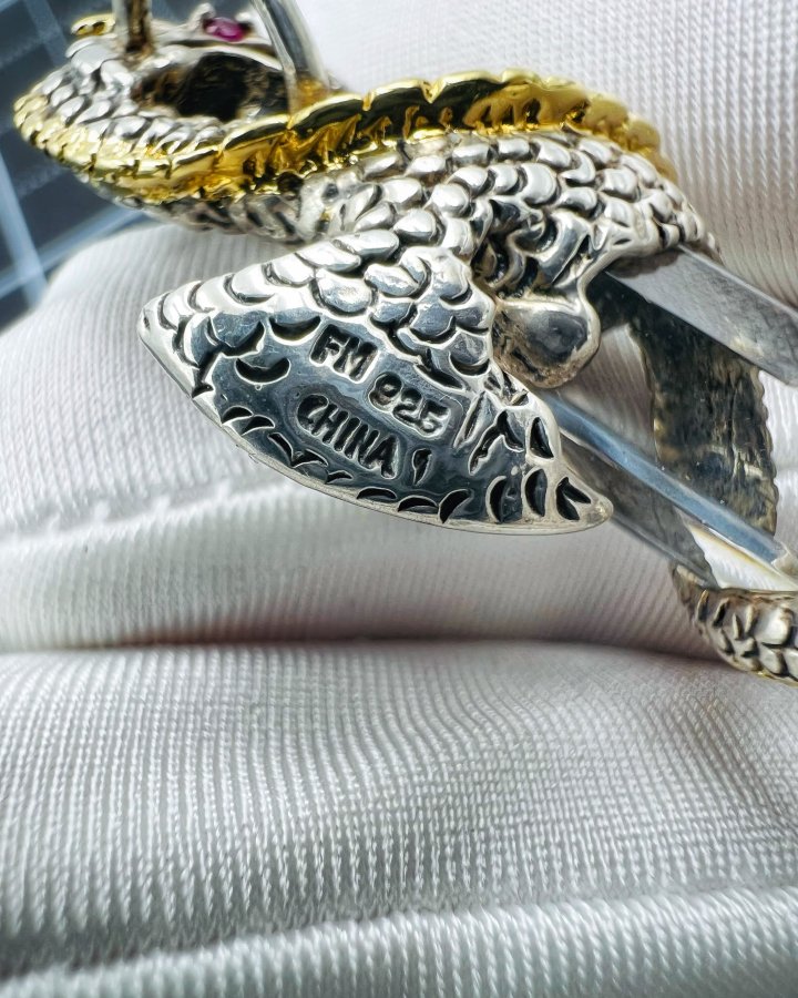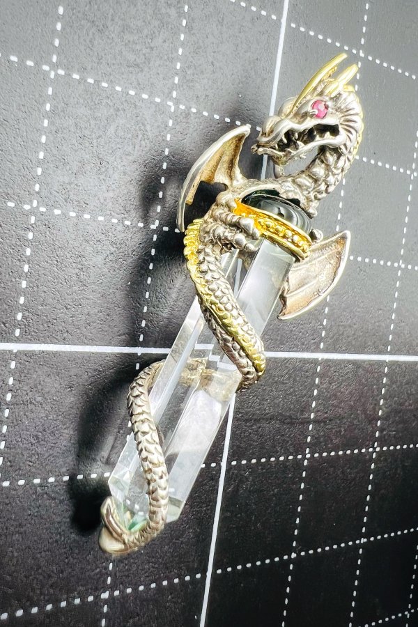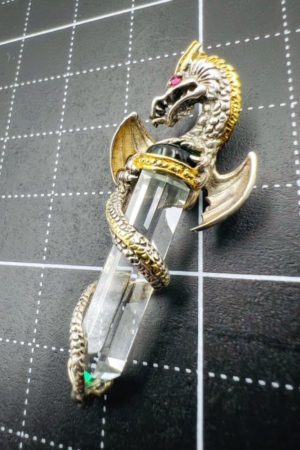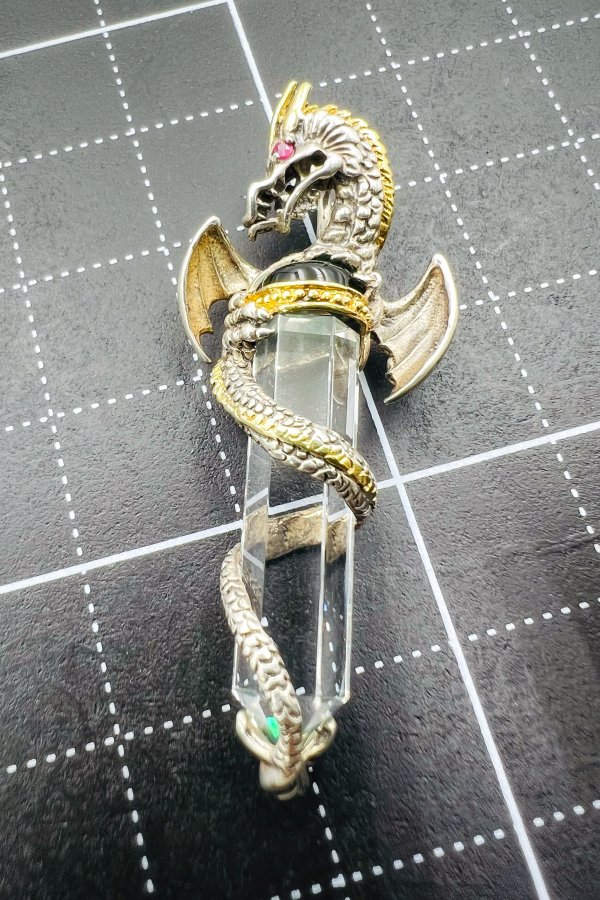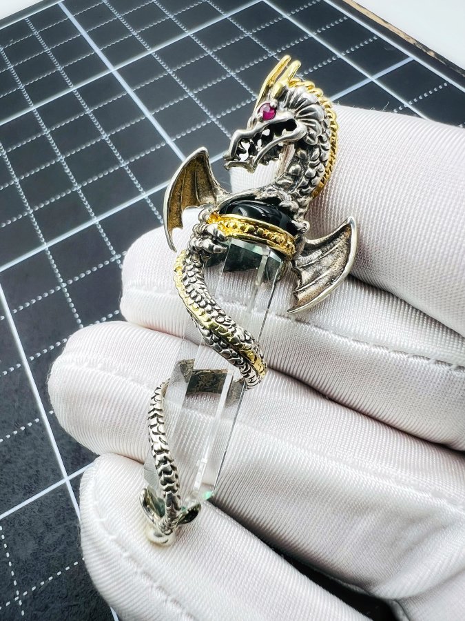 Mặt trụ đá thạch anh bọc rồng bạc 925 lake vàng đemi 2 màu hiệu FM hoa văn sắc nét 2 mắt đính rubi 1.6li rất đẹp, size 22x55mm, nặng 12.1gram (3.23 chỉ), giao thông 3tr2❤️ Thiên 0923.12.6789