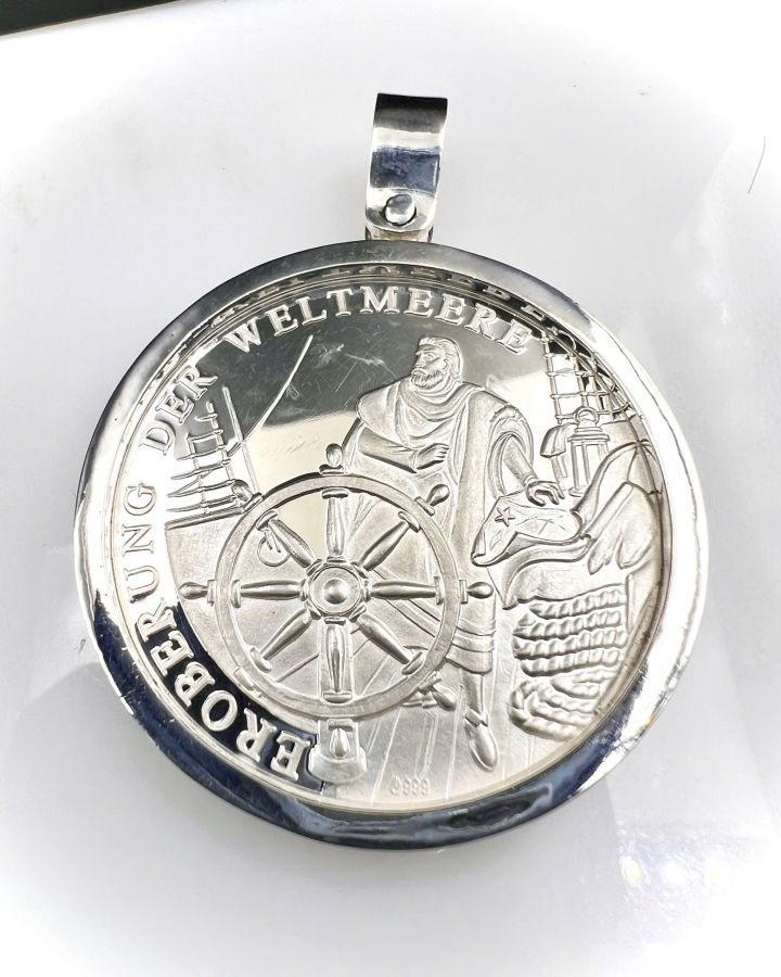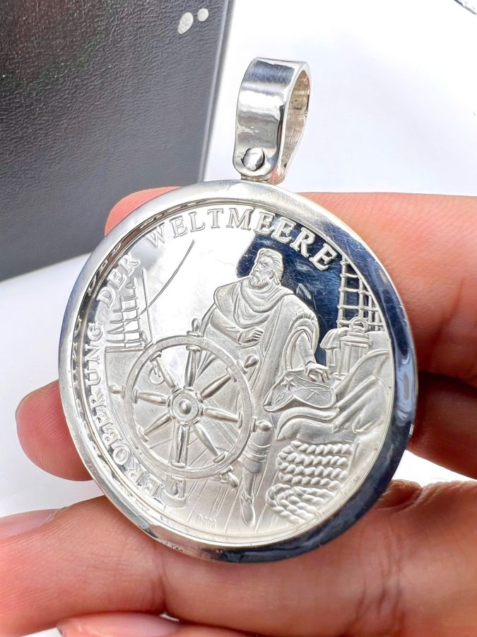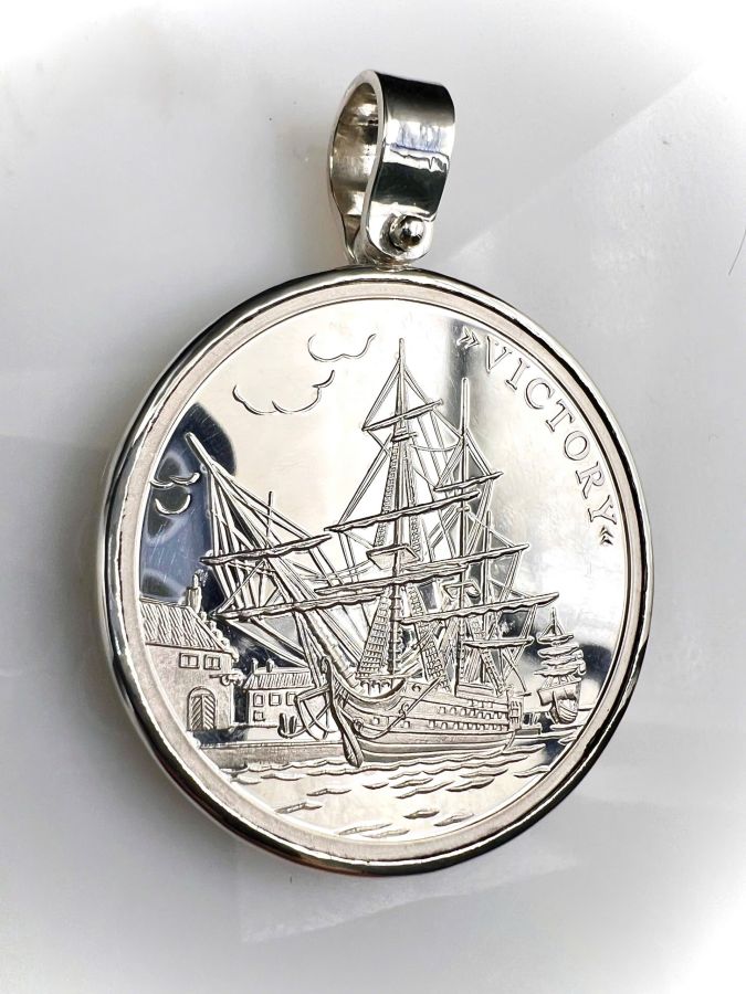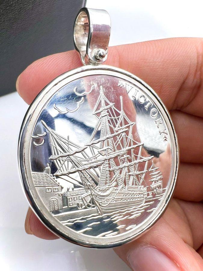 Mặt xu bạc thuận buồm xuôi gió thuyền Victory mới tinh hoa văn sắc nét rất đẹp, đeo được 2 mặt, size 43x57mm, khoen lớn lỗ 8mm, nặng 31.34gram (8.36 chỉ)