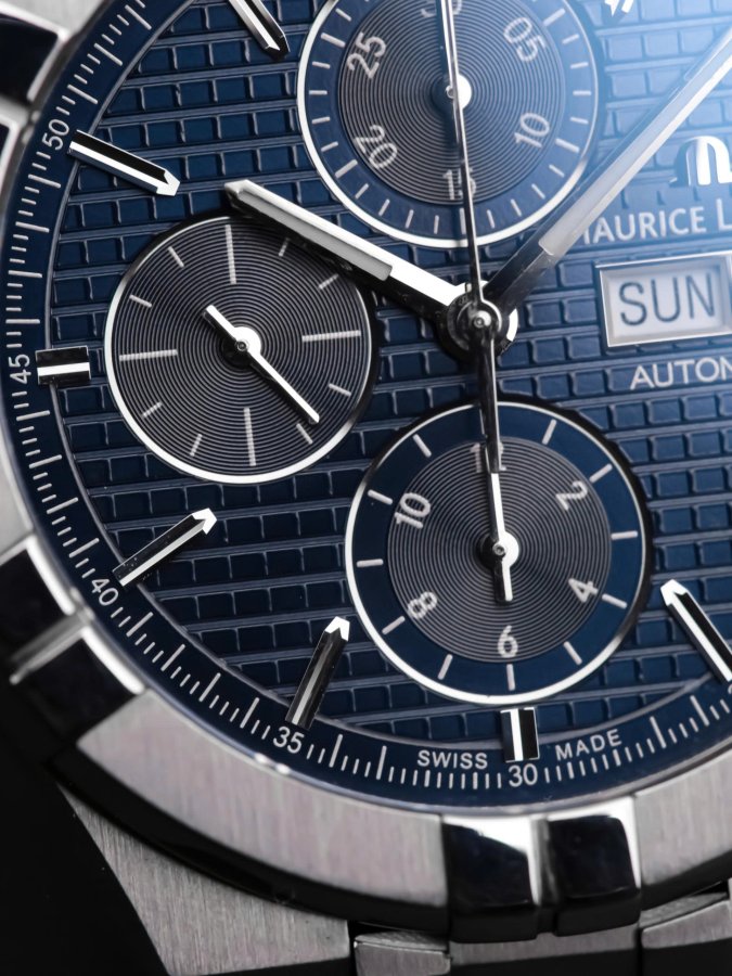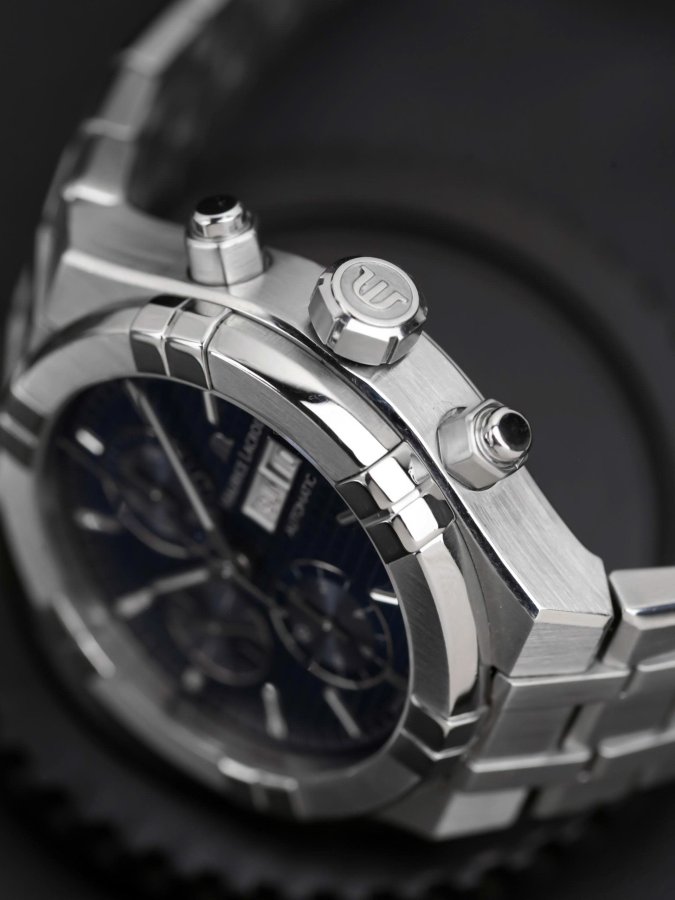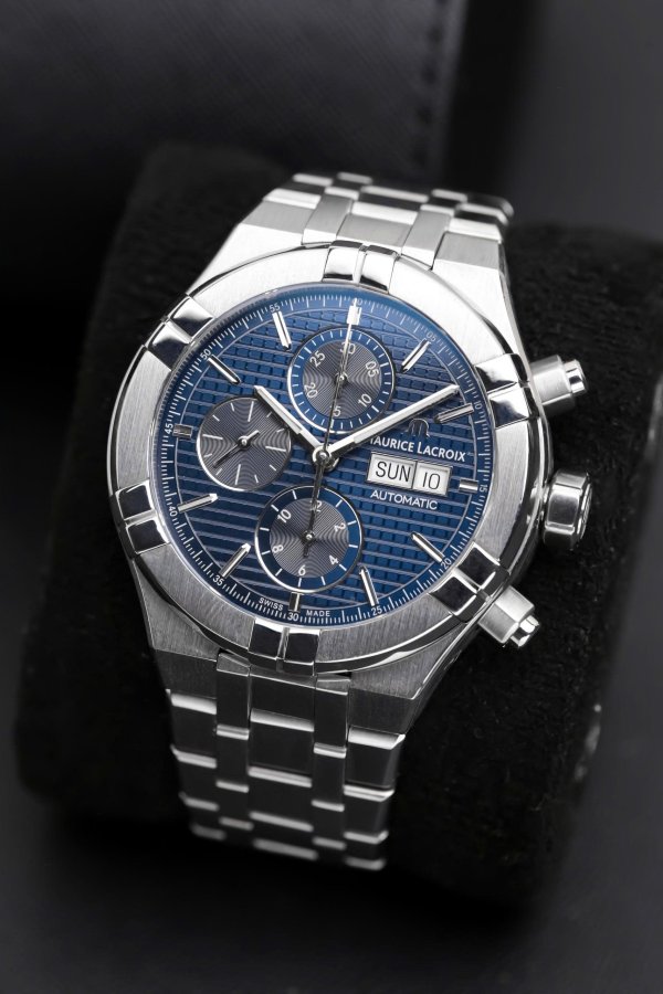 Trang bị cỗ máy bấm giờ chronograph cao cấp, dòng Aikon được lắp máy top grade nên đảm bảo bền bỉ và chính xác. Mặt dial deep blue vân Cotes de Geneva thay đổi màu sắc theo ánh sáng, góc nhìn tuyệt đẹp.