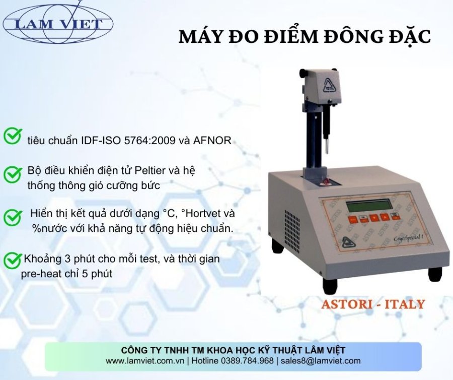 Máy đo điểm đông đặc CryoSpecial 1 của ASTORI là thiết bị đo đơn mẫu để xác định nhanh lượng nước thêm vào mẫu sữa hoặc kem trên cơ sở đo độ thay đổi điểm đông đặc.