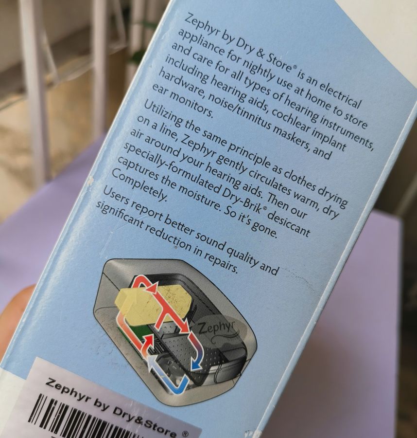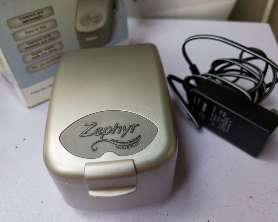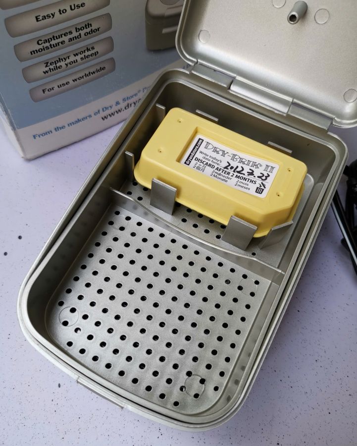 Hộp đựng và hút ẩm mini Zephyr U.S.A sx cho thị trường Nhật. Chuyên dụng cho tai nghe trợ thính, headphone hi-end đắt tiền, đồng hồ....