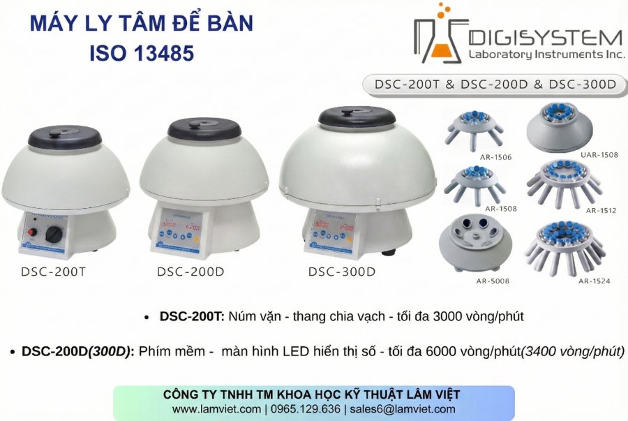 Máy ly tâm Digisystem (Đài Loan) đáp ứng đa dạng nhu cầu tách, lắng, tinh chế mẫu trong các lĩnh vực y tế, sinh học, hóa học, kiểm nghiệm thực phẩm và nghiên cứu khoa học. Với hơn 40 năm kinh nghiệm, Digisystem Laboratory Instruments Inc. – Đài Loan là thương hiệu uy tín toàn cầu, nổi bật bởi chất lượng bền bỉ – độ chính xác cao – giá thành hợp lý.